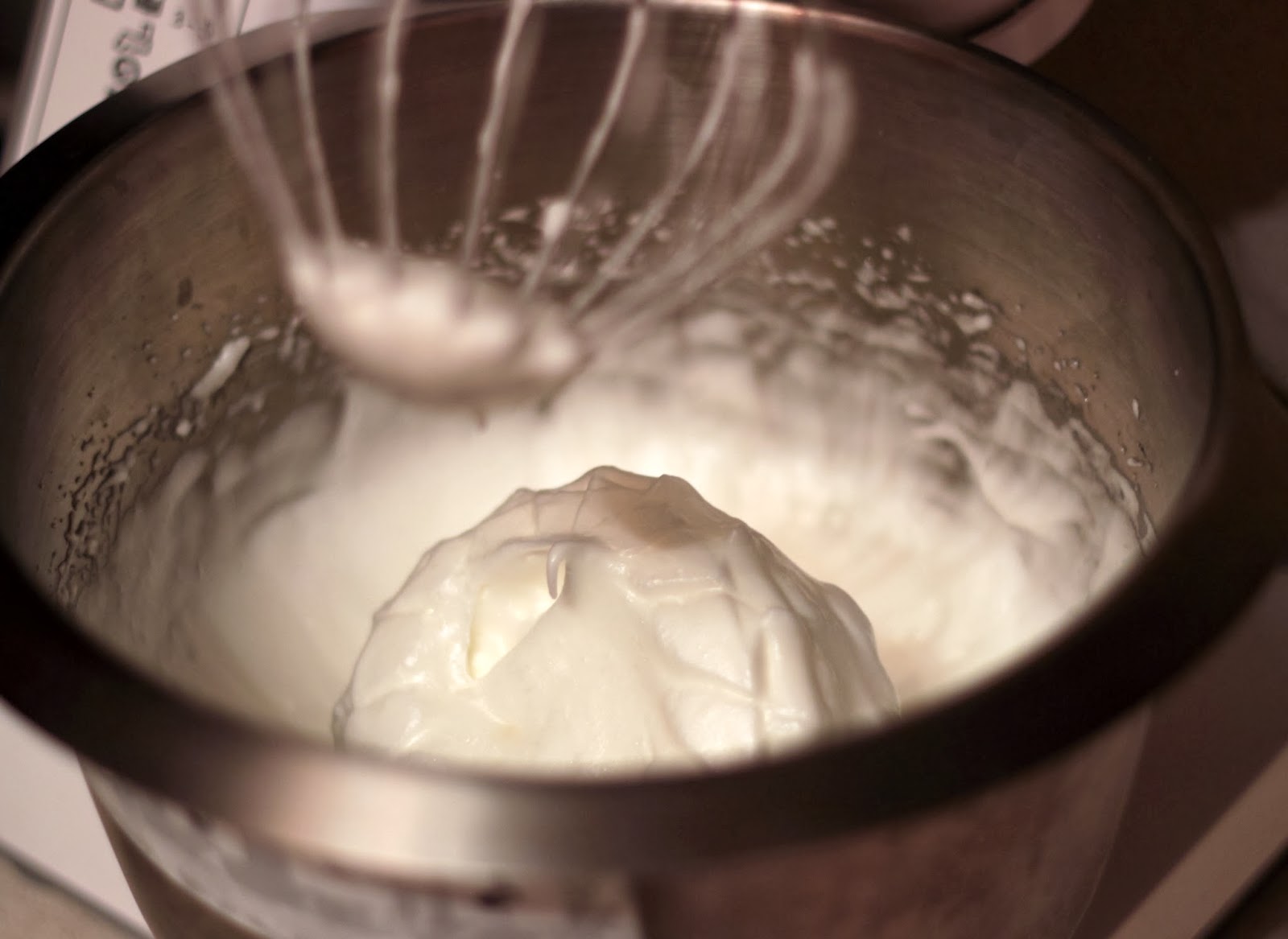 Взбить белки с сахаром до жестких пиков. Добавить взбитые белки к сухой смеси и аккуратно перемешать снизу вверх, вращая при этом чашу по часовой стрелке.