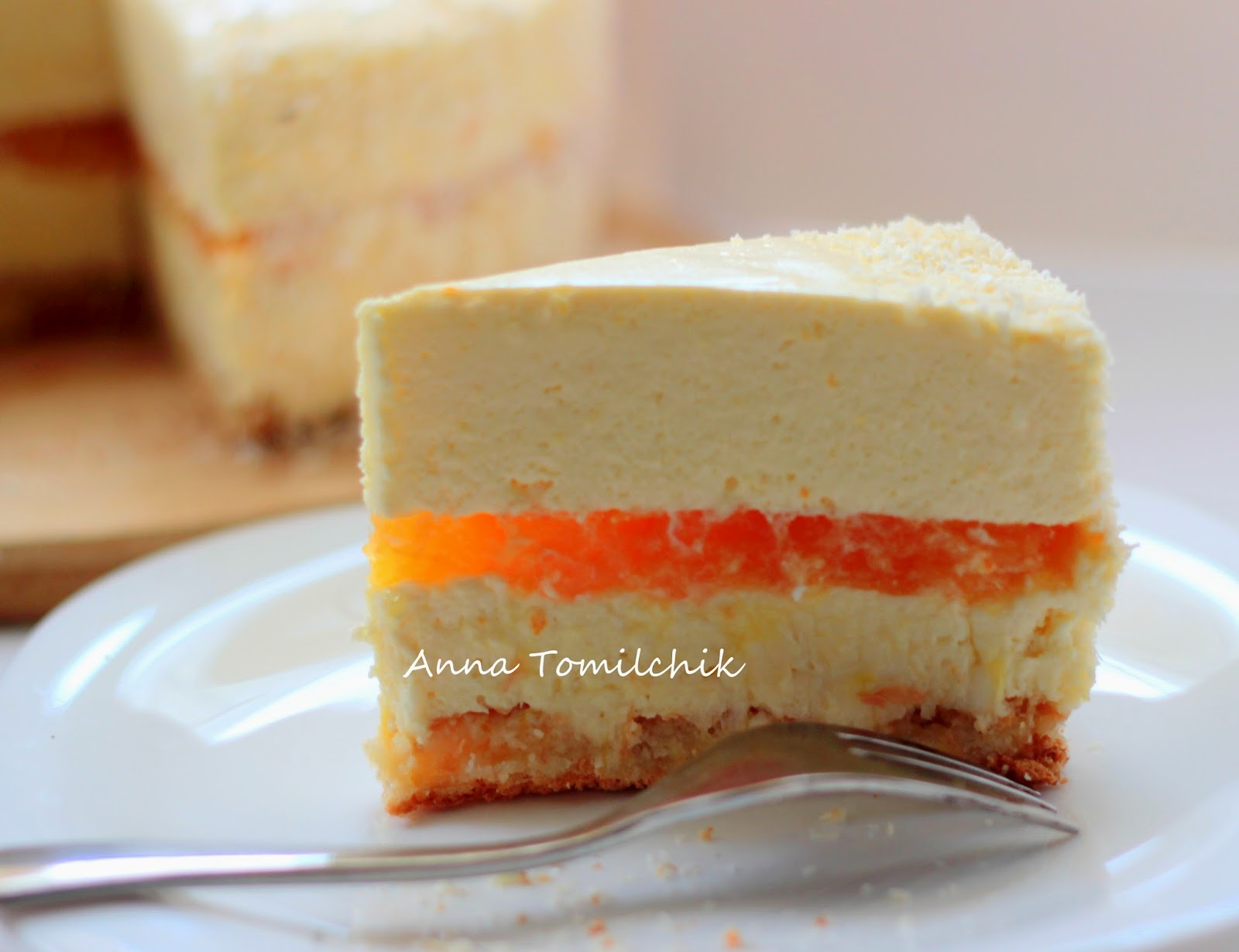 Я как-то особенно долго думала над этим тортом, обычно мои идеи реализуются быстрее. С одной стороны хотелось сделать особенный торт, а с другой - простой, который можно сделать быстро, пусть и в несколько заходов. За сложные и длинные рецепты я временно не берусь в силу определенных причин (но у меня есть длинный список, который я обязательно выполню, как появится возможность). Я сразу знала, что в основе будет кокосовый дакуаз, рецепт которого нашла в книге Эрме. Апельсиновое желе тоже быстро стало одной из составляющих. А вот насчет кремов и муссов я долго размышляла... В конце концов было принято решение, что это будет любимый чизкейк. Идею многокомпонентных чизкейков я взяла кстати у того же Пьера Эрме, чизкейк Сатин по рецепту которого меня просто сразил. Итак,