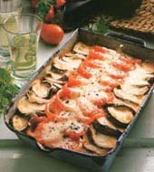 Слоями выложить в огнеупорную форму баклажаны, фарш, кружочки помидора без кожицы (помидор предварительно бланшировать и снять кожицу). Верхний слой должен быть мясным.