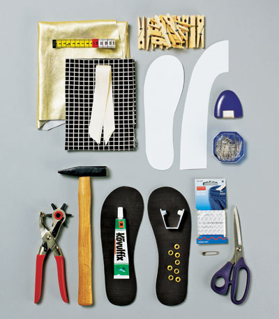 Вам понадобится: позолоченная кожа, ткань, 2 пары подошв, блочки, эластичная тесьма, клей, бельевые прищепки, молоток, булавки.