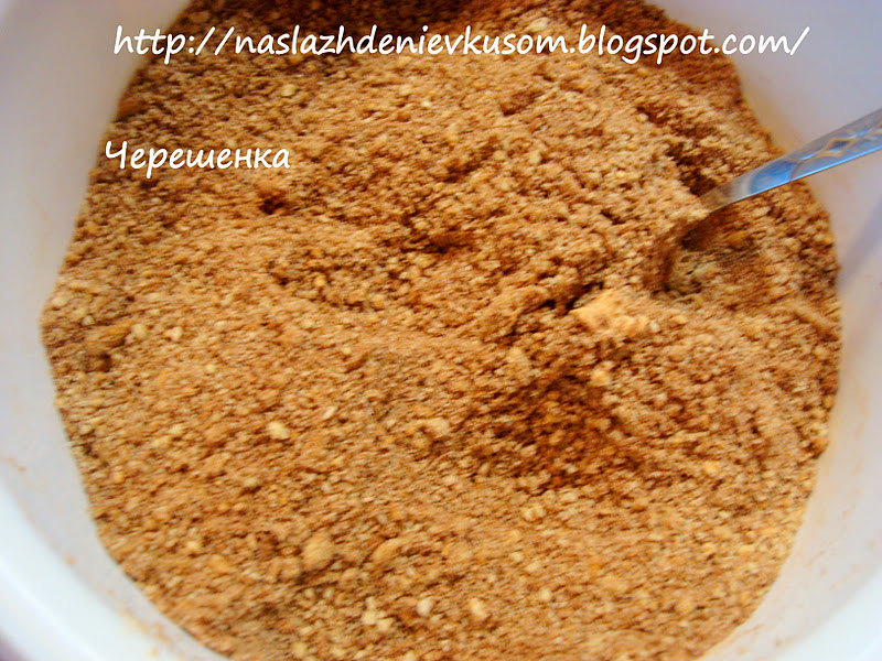 Теперь все крошки высыпаем в миску, добавляем какао-порошок и все хорошо перемешиваем, чтобы в дальнейшем какао хорошо и равномерно распределилось по пирожным…
