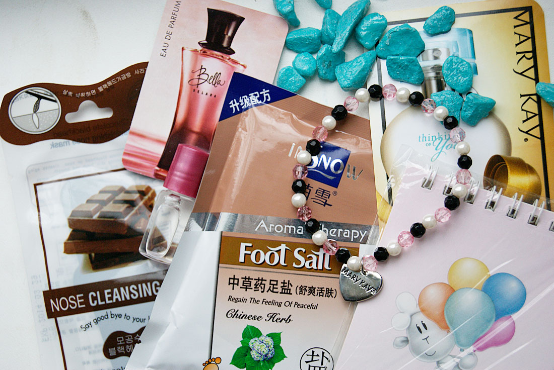 Тут маленький флакончик духов, соль для ножных ванночек,милый блокнотик :3, календарик, полоски от черных точек:)