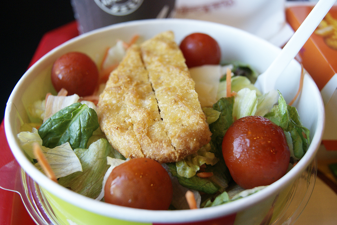 Вчера Валера вечерком вытянул меня погулять. Я думала, что не смогу уже выйти никуда, т.к. у меня УЖАСНО болел живот. Но выпив несколько таблеток,я все же вылезла) И Валера потащил меня в Макдак :D Я съела только салатик. Наааа фиг там часто есть, но иногда побаловаться ведь так приятно, согласны?:)