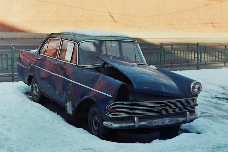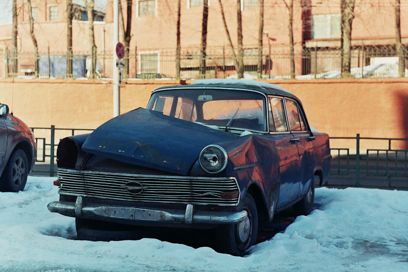 А по теме, вот что скажу. Обещал ведь отснять те заброшенные машины на плёнку. Полюбуйтесь, всё в лучшем виде. Снег ещё лежит. Самое начала апреля. В тот день и с погодой повезло. И машины на парковке не были заставлены соседями. Бонусом еще католический собор и пара уличных зарисовок.