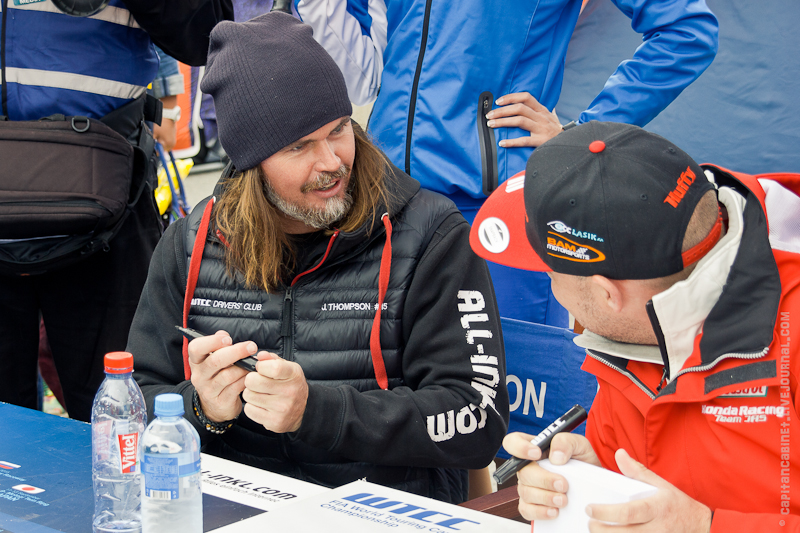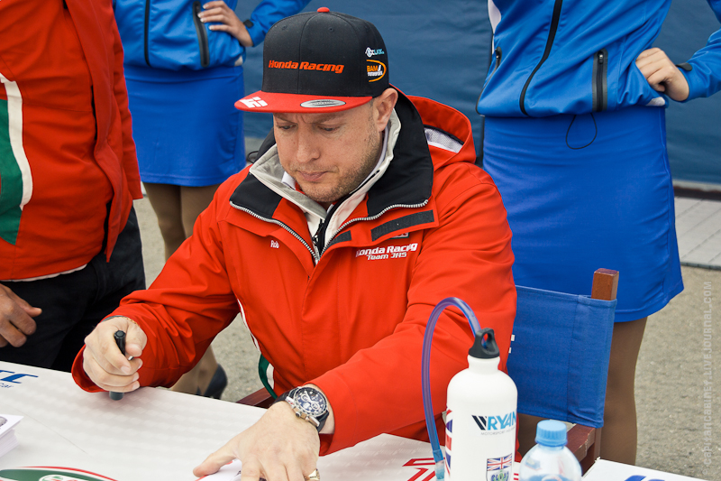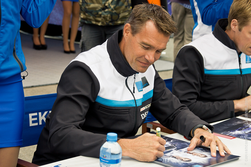 Следующей обязательной частью мероприятия было новое знакомство с пилотами. Кто-то ушел из серии, кто-то пришел. Кто-то сменил команду. Важно было поучаствовать в этой автографсессии, напомнить себе, и оставить фотографии на будущее. Несмотря на погоду, все прошло по расписанию. Пилоты заняли свои места и подписали многочисленным желающим памятные карточки и плакаты. Ну а я просто хотел сфотографировать командную линейку.