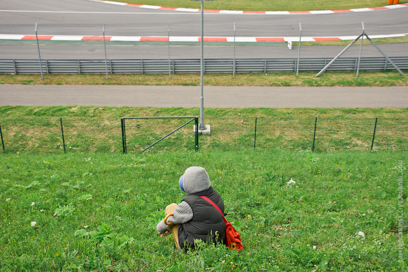 А дальше началось самое интересное. Время подходило к старту, потому мы направились на самую дальнюю трибуну, на холм. Погода до этого момента была вполне благосклонна, но теперь началось... Все хорошо на этой стоячке, ракурсы обзор. Одна из лучших трибун автодрома. Но она открытая, и далеко от основного комплекса, прятаться некуда. Только пелетон проехал прогревочный круг и занял место на стартовой решетке, как ливануло! И прятаться нам было негде. Несколько девчонок только юркнули в полицейскую машину ))). А главное, старт отложен, поливало от души. И проблема была в том, что тучи шли одна за другой. Пока все процедуры проведут заново, уже следующий залп ливня начнется!
