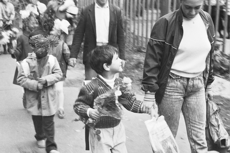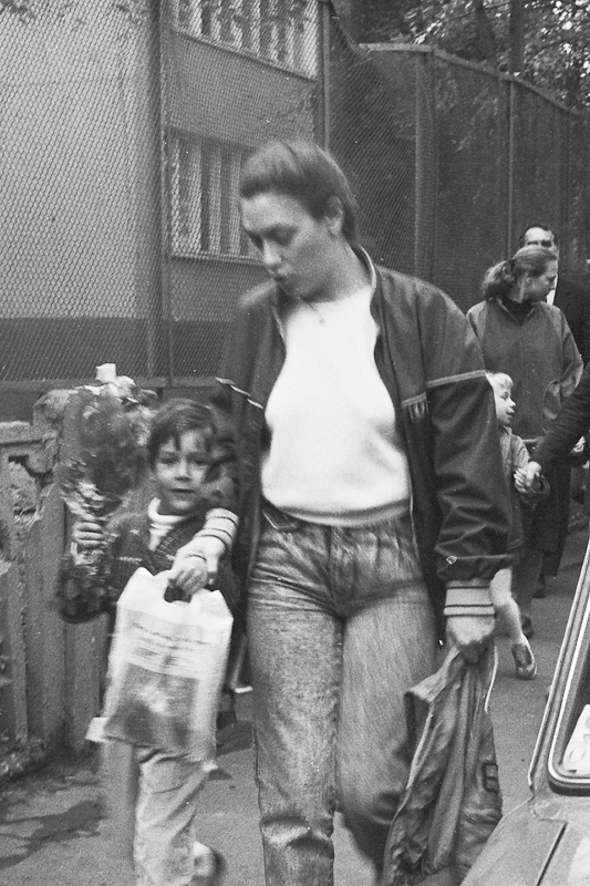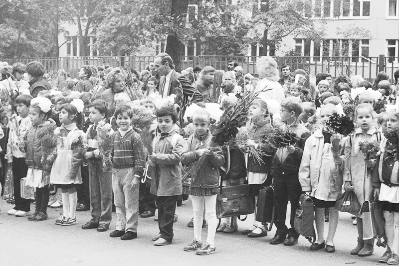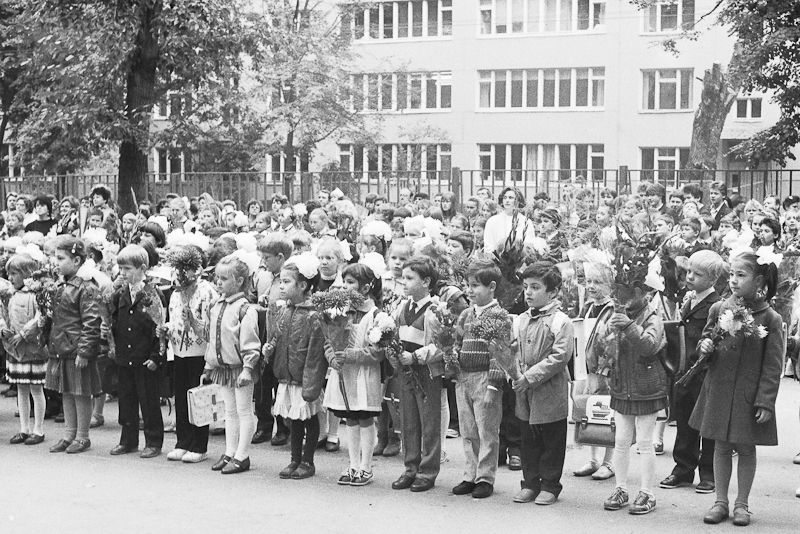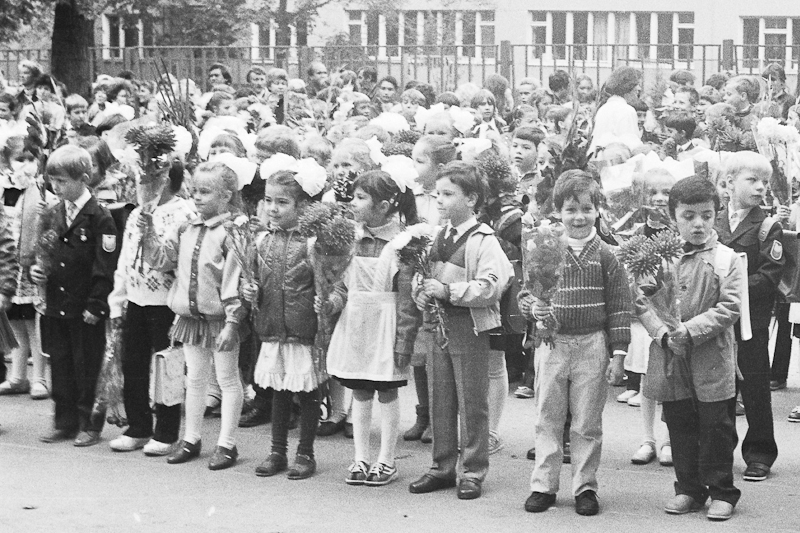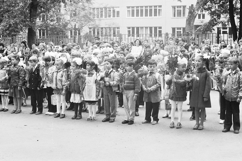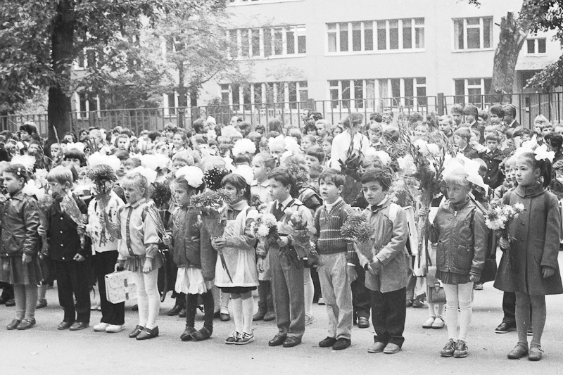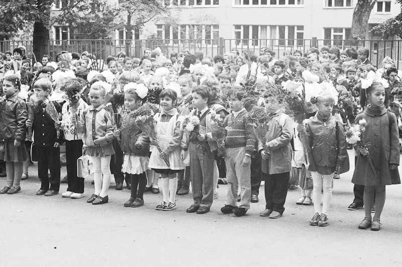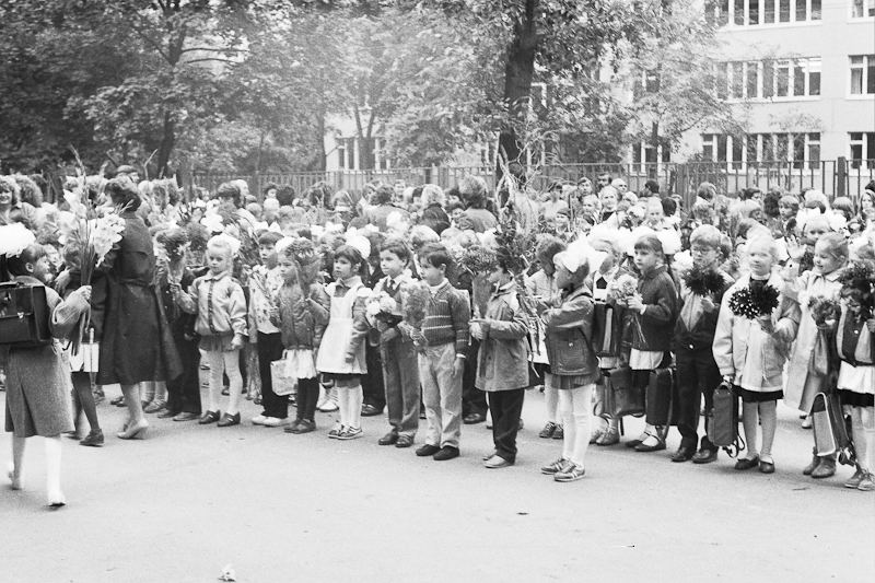 Есть еще плёнка из детских запасов, которую я сканировал на днях. Там не так много интересного, но покажу. Рассказывать особенно нечего. Это мой первый класс, линейка. Одна из фотографий есть у меня на бумаге, лет шесть назад я её показывал, когда мой сын в школу пошел. А теперь к сентябрю и остальные мои снимки появились. Очень вовремя =)) Однообразно, но пусть уж лежит.