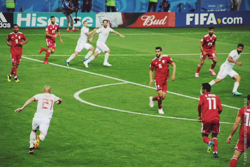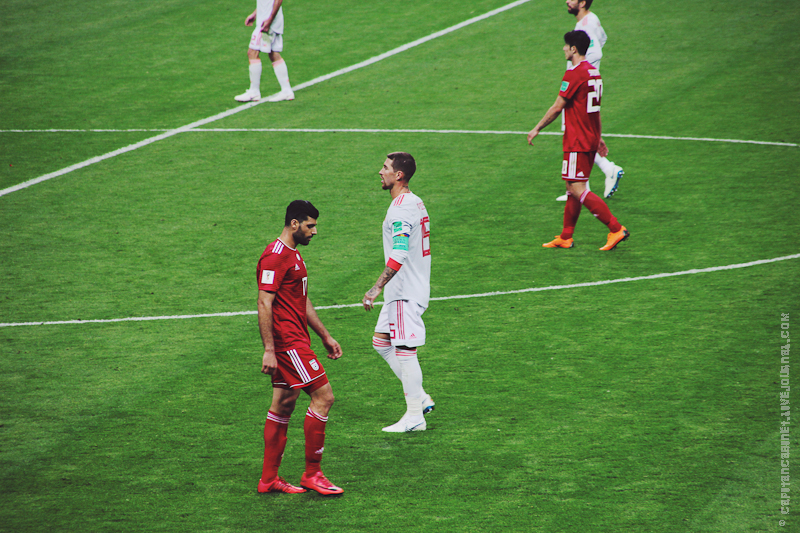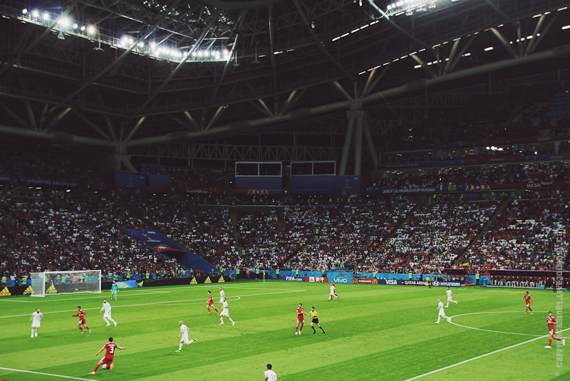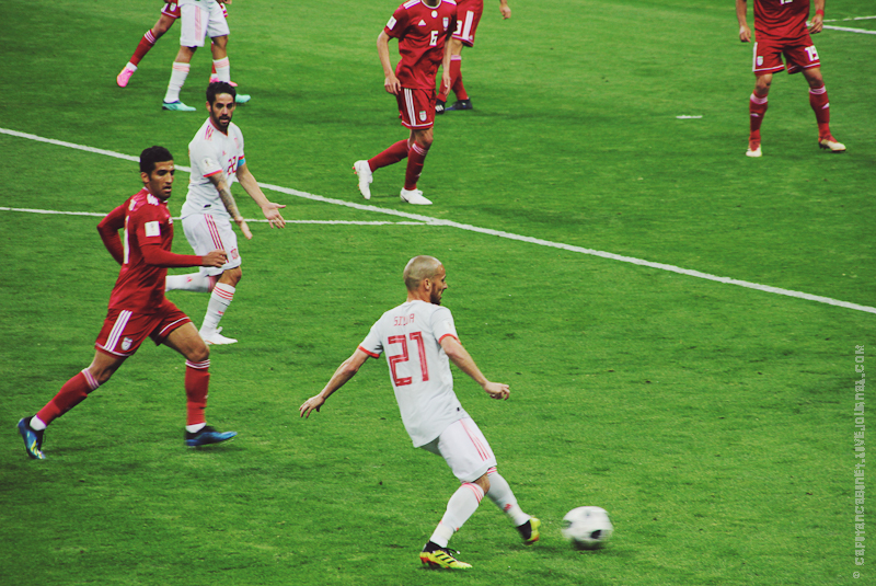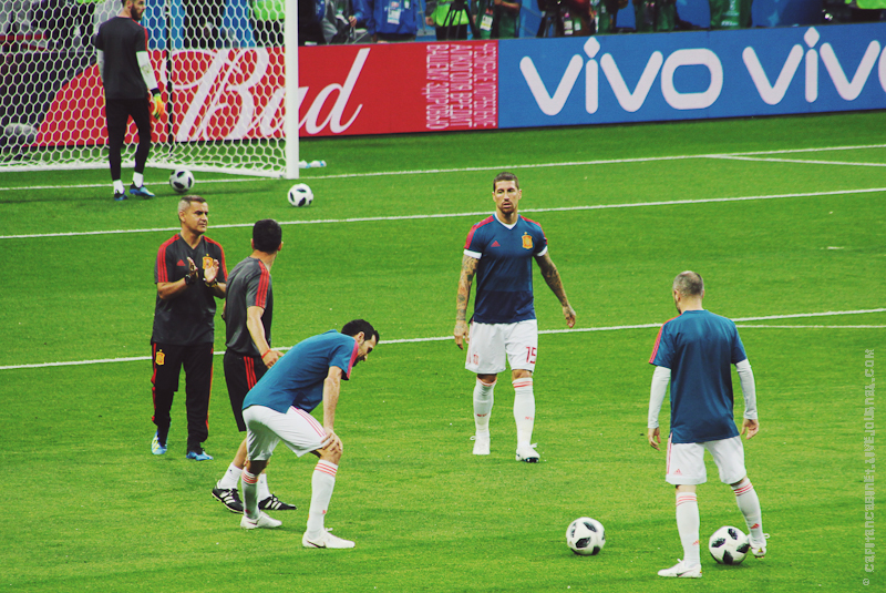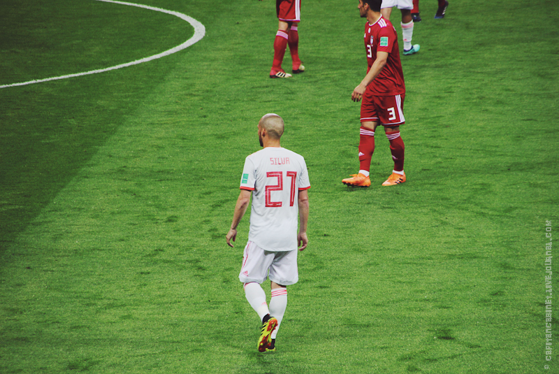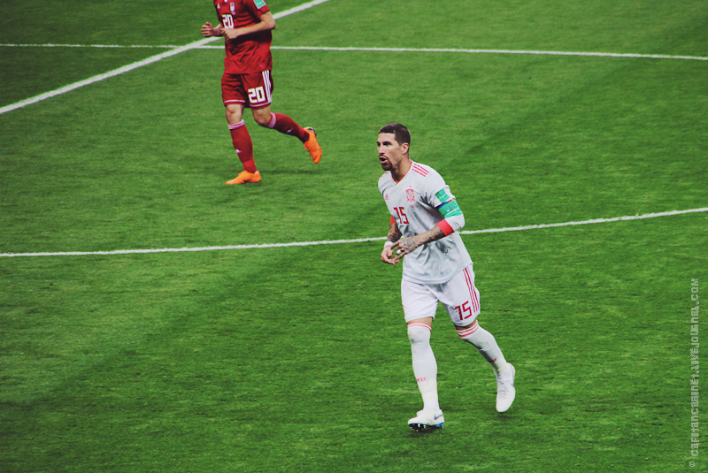 Игру все видели. Иранцы рвались вперед. Защищались как могли. Но по цифрам все инициатива была у испанцев. Нервно, был и гол из офсайда, и устное предупреждение Диего Косте. Уж думал, не удалят ли... Но в целом, карточек и спорных моментов не много. На стадионе отлично видно как работает команда, обзор намного шире. И индивидуальные действия игроков, которые часто остаются за кадром. Победа с минимальным счетом. Под конец игры, и капитан сходил в атаку. Раз, раз и Рамос через фланг уже в штрафной. Наблюдал за ним, весь вечер был предельно суров и мрачен. Даже когда один отправился благодарить болельщиков.