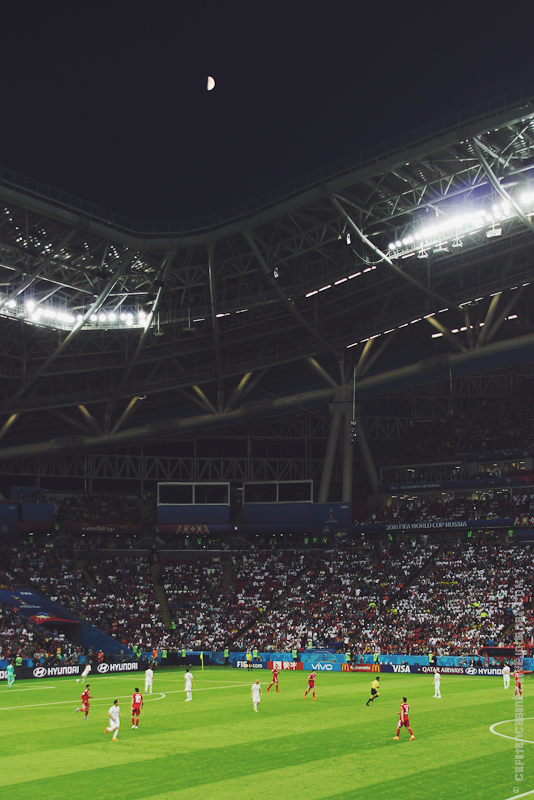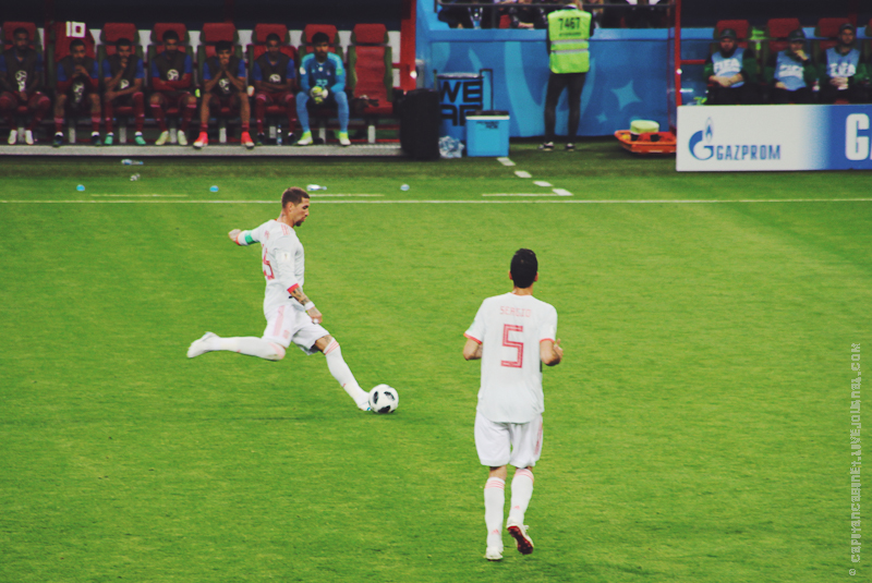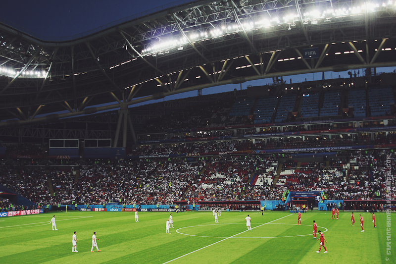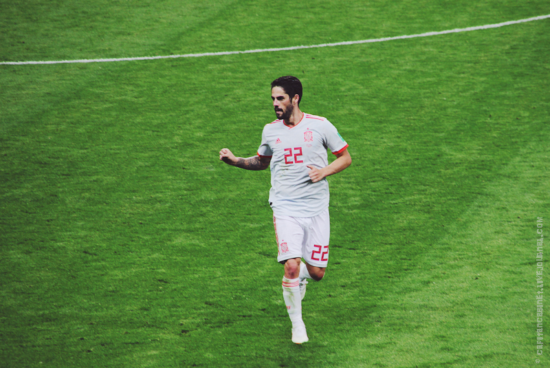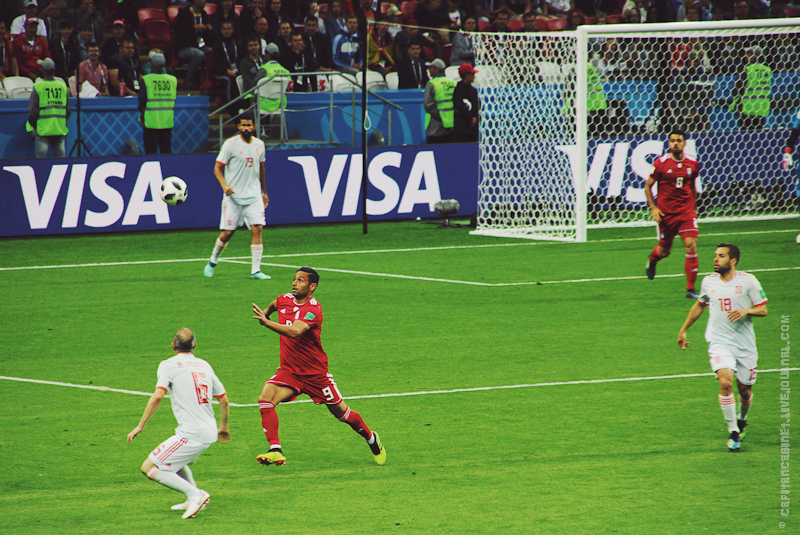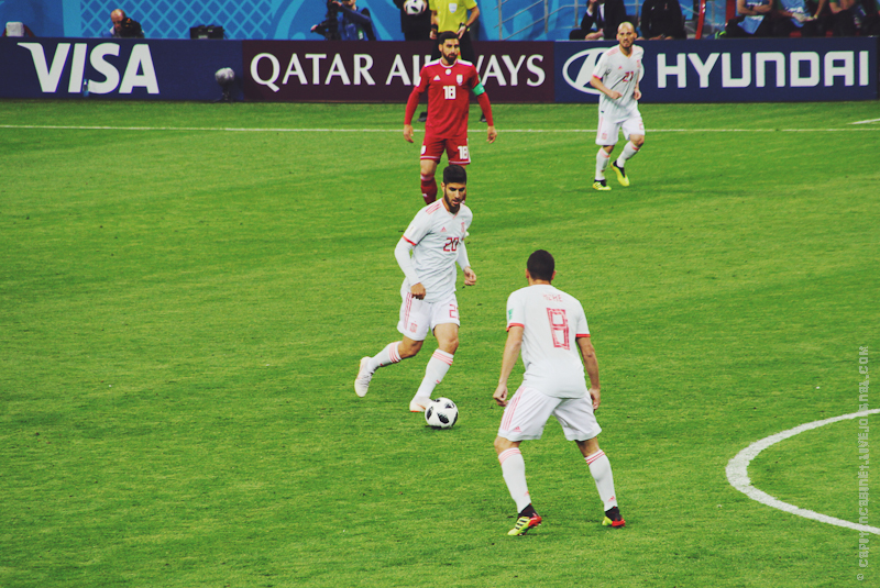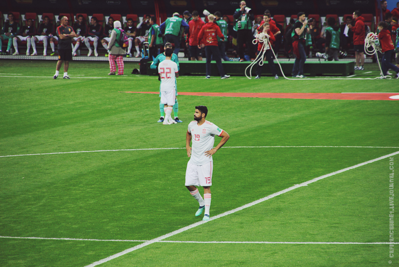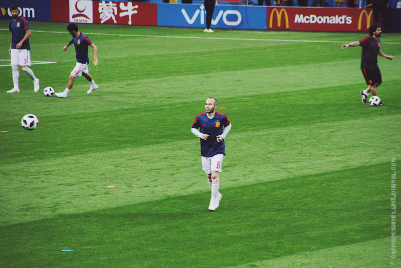 Игру все видели. Иранцы рвались вперед. Защищались как могли. Но по цифрам все инициатива была у испанцев. Нервно, был и гол из офсайда, и устное предупреждение Диего Косте. Уж думал, не удалят ли... Но в целом, карточек и спорных моментов не много. На стадионе отлично видно как работает команда, обзор намного шире. И индивидуальные действия игроков, которые часто остаются за кадром. Победа с минимальным счетом. Под конец игры, и капитан сходил в атаку. Раз, раз и Рамос через фланг уже в штрафной. Наблюдал за ним, весь вечер был предельно суров и мрачен. Даже когда один отправился благодарить болельщиков.