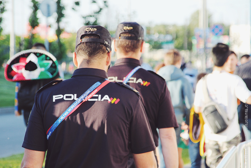 На игру, с болельщиками приехали и испанские полицейские. Очень заметно выделяется Гражданская Гвардия Испании, на фоне коллег из России.