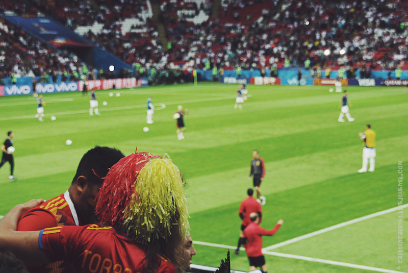 Первые впечатления после матча. Наконец, на Чемпионате Мира по Футболу. И на игре Красной Фурии! Дождались гола Диего Косты, чтобы выпустить из легких весь тот воздух и голос, который копили в ожидании. Блестяще! Все, как на ладони :D. Победа! Иран - Испания 0:1. Даааааа! В тот день все матчи закончились с минимальным счетом, но какое напряжение было. По очкам и мячам идем с Португалией нога в ногу. Днем матч португальцев с мароканцами, пошли смотреть в паб. Размяться перед стадионом.
