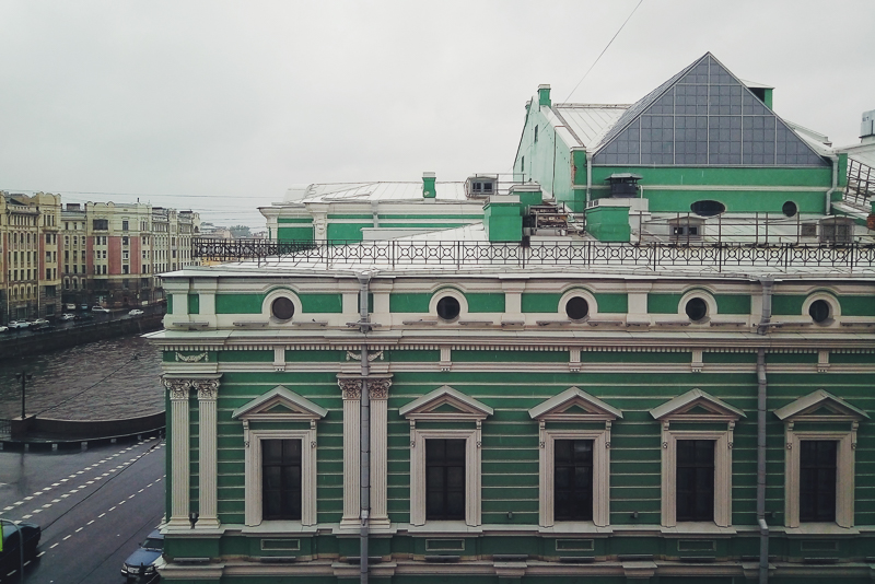 Мое любимое фото. Изнанка города. Если окна номера выходят на Фонтанку и Большой Драматический Театр, то из коридора можно увидеть такую панораму. Хорошо заметны главные городские достопримечательности: Башню с часами не опознал, а затем слева на право, купол Исакиевского собора, шпиль Петропавловской крепости, Русский Музей, Казанский собор, Адмиралтейство и Зингер. Абсолютно случайно нашелся третий Петербургский сфинкс. Совсем забыл о его существовании. И снова, впечатляет.