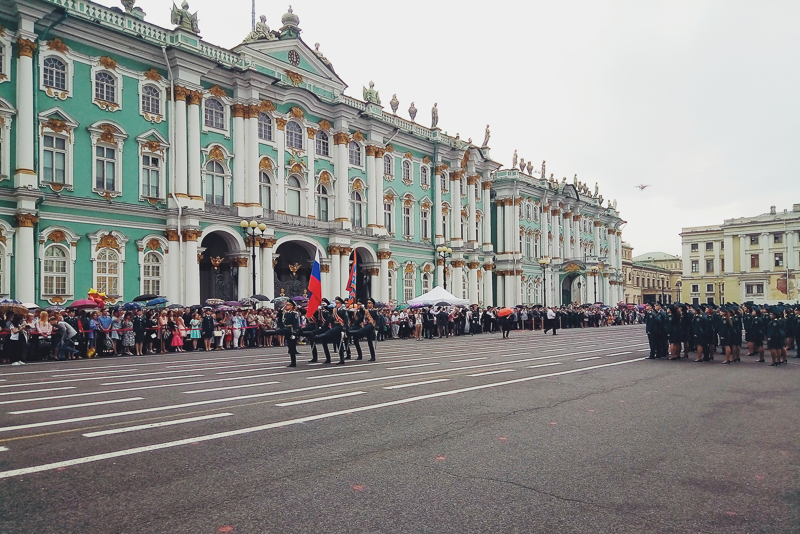 Исакиевский Собор, наконец, закончивший реставрацию, Уютная Новая Голландия, Марширующий выпускной МЧС у Зимнего Дворца, Николо-Богоявленский Морсой Собор на стрелке Грибоедовского и Крюкова каналов, Ночной вид на любимый Дом у Красного Моста, Дворцовая площадь, освободившаяся от лишних построек, Укрывающий от дождя кинотеатр Аврора, Неожиданный корвет Балтийского флота - Сообразительный, на Неве.