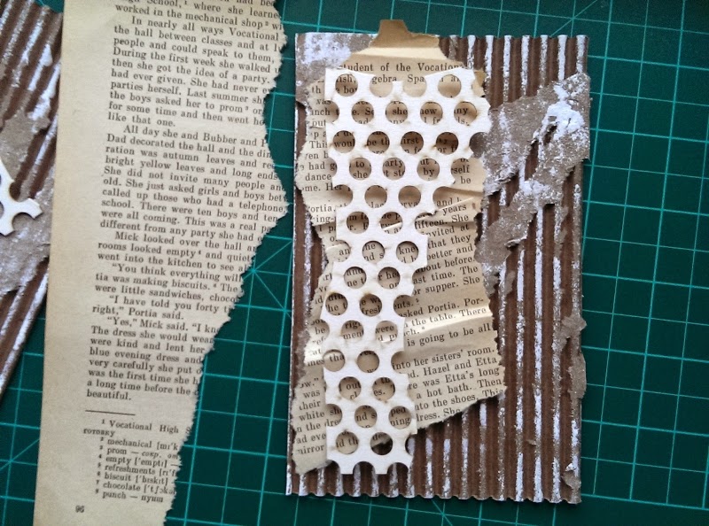 Затем я добавила фоновый чипборд, чтобы усложнить фон. Чипборд в таких открытках я обычно не декорирую (натуральное дерево)):