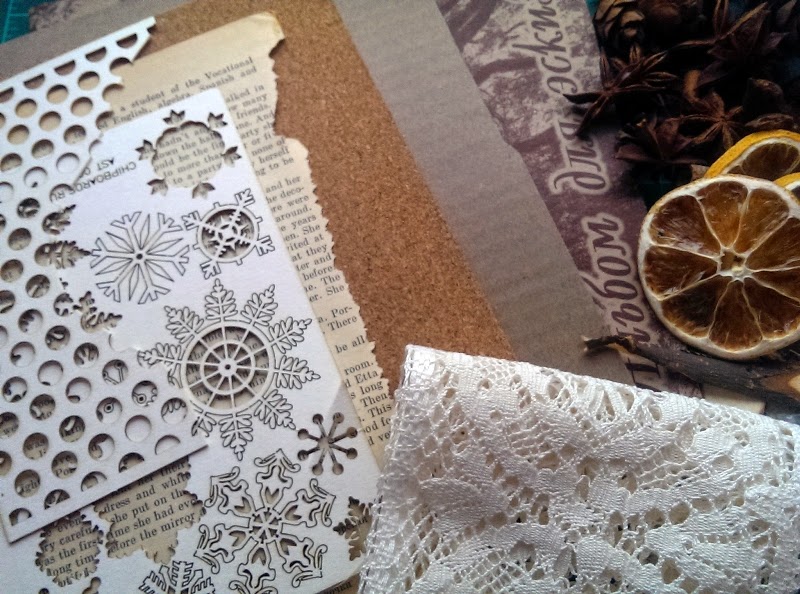 А теперь самое интересное и творческое - создаем композицию. В качестве акцентов у меня чипборд-снежинки, засушенный лимон (я сушила его естественным путем: разрезала лимон на ломтики и разложила на салфетке прямо на батарее - занимает процесс сушки в таком случае около 5 дней), и "цветочная" композиция из ягодок, шишек ольхи, корицы с бадьяном: