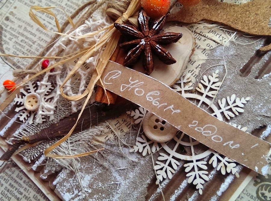 Уже из названия стиля понятно, что если мы хотим сделать открытку в ЭКО-стиле - мы используем по максимуму натуральные природные материалы. И это как раз тот случай, когда нет необходимости покупать специальные скрапматериалы - ведь для открытки можно использовать то, что под рукой: гофрокартон (от упаковочной коробки, например), джутовый шнур или бечевку, в отделе специй можно приобрести палочки корицы и звездочки бадьяна, также можно взять ломтики апельсина или лимона (предварительно, конечно, засушив их), кожуру от мандаринов (сделав из нее звездочки)), в магазине тканей легко найти натуральный лен, хлопковое кружево и деревянные пуговки. А кто был предусмотрительным и собирал летом гербарий и шишки - самое время всё это достать! Еще рекомендую никогда не выбрасывать упаковку от цветочных букетов - там можно найти рафию, сизаль, джут...