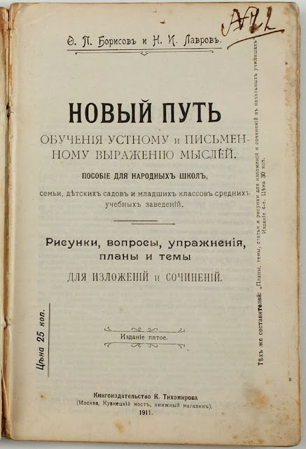 "Новый путь обучения устному и письменному выражению мыслей". Пособие для народных школ, семьи, детских садов и младших классов средних учебных заведений. Ф.П. Борисов и Н.И. Лавров. Книгоиздательство К.Тихомирова, Москва 1911 год.