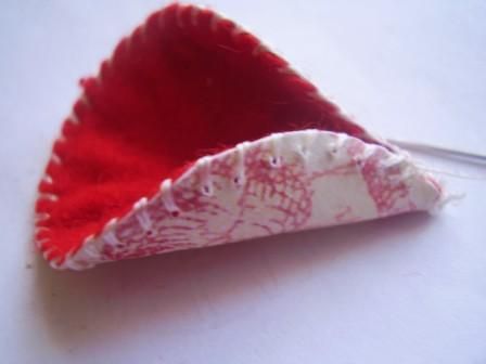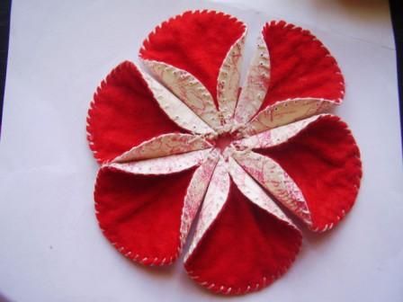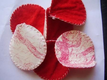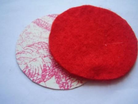 Берем 6 кругов из плотной бумаги радиус каждого по 2см, я использовала бумагу Prima из коллекции "Flights of Fancy" также берем 6 кругов из ткани того же диаметра. Я использовала фетр красного цвета.