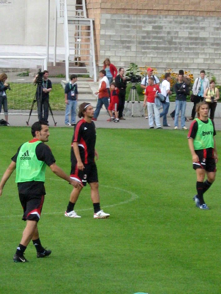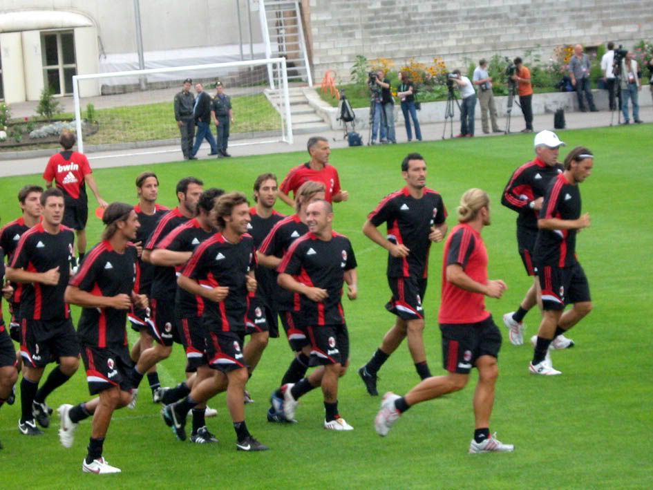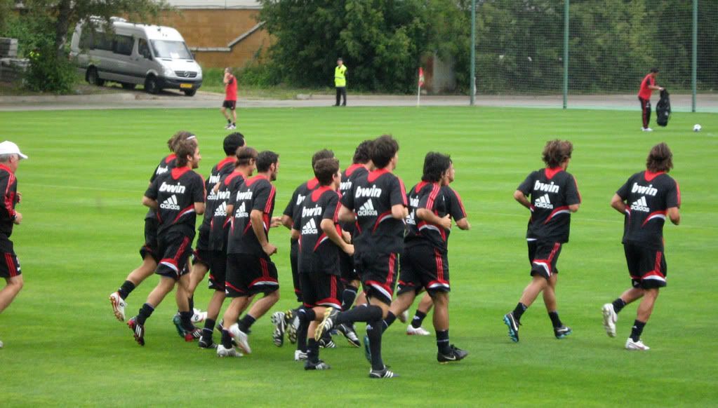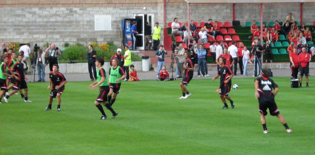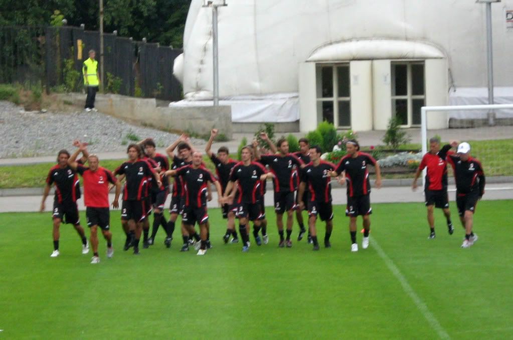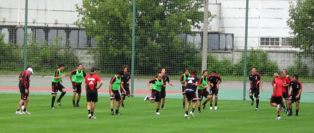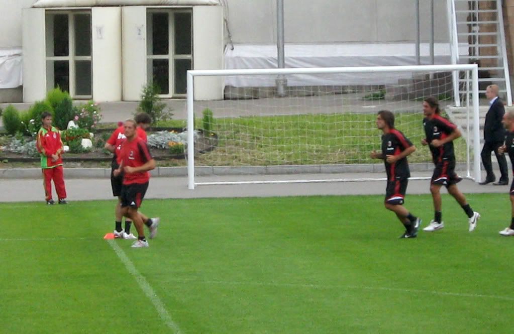 Тем временем миланцы вышли на поле, свеженькие, как огурчики. Мы просто поразились! В первых рядах бежал наш Капитан и улыбался. Все же он в потрясающей форме! По началу тренировка Милана выглядела весьма однообразно. Они бегали из одного угла поля в другой, периодически останавливаясь в этих самых углах и делая различные упражнения. Каха так усердствовал, что ему даже потребовалась помощь врача. К счастью, ничего серьезного.