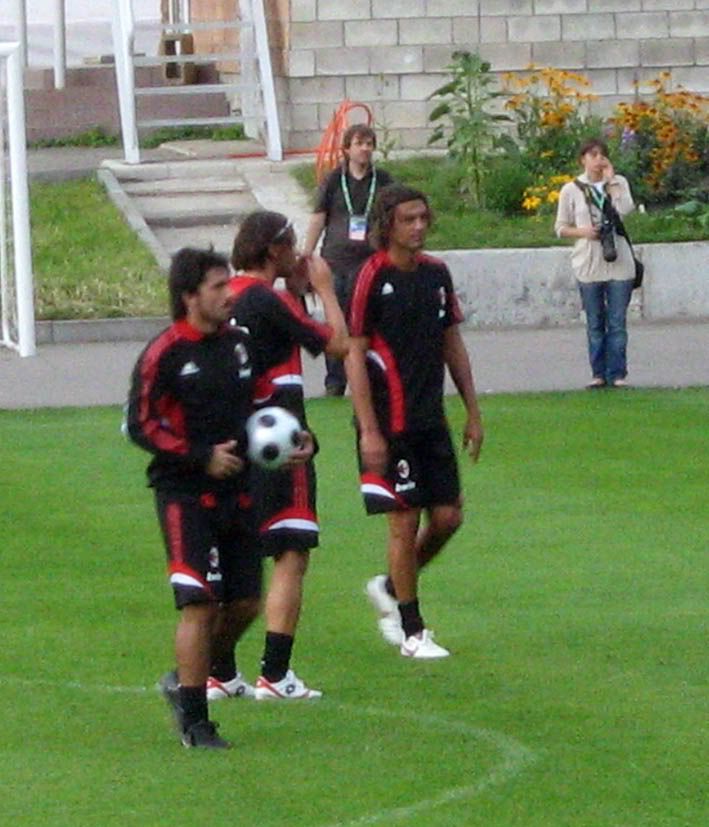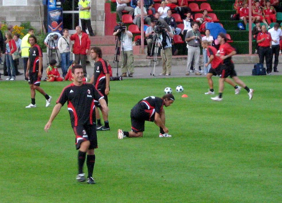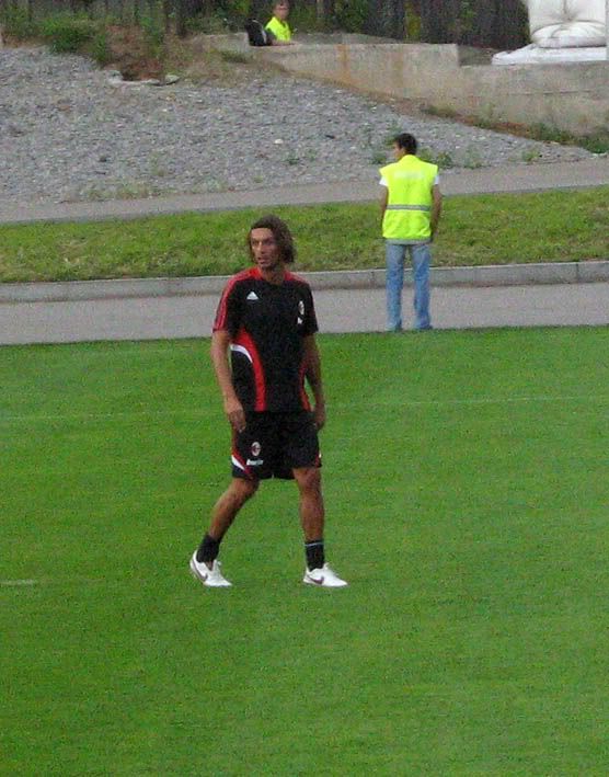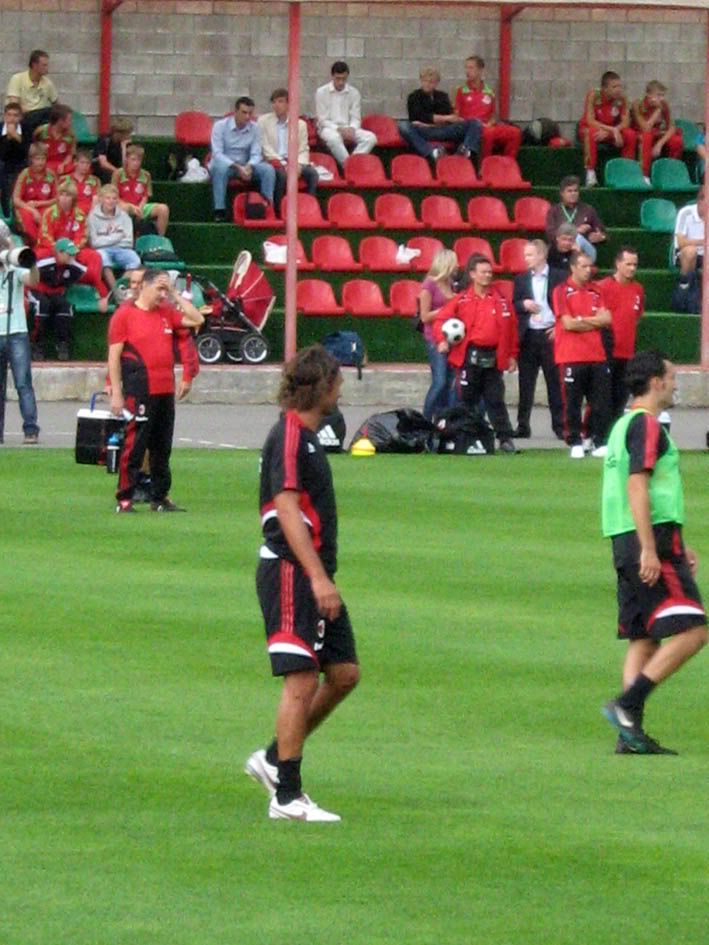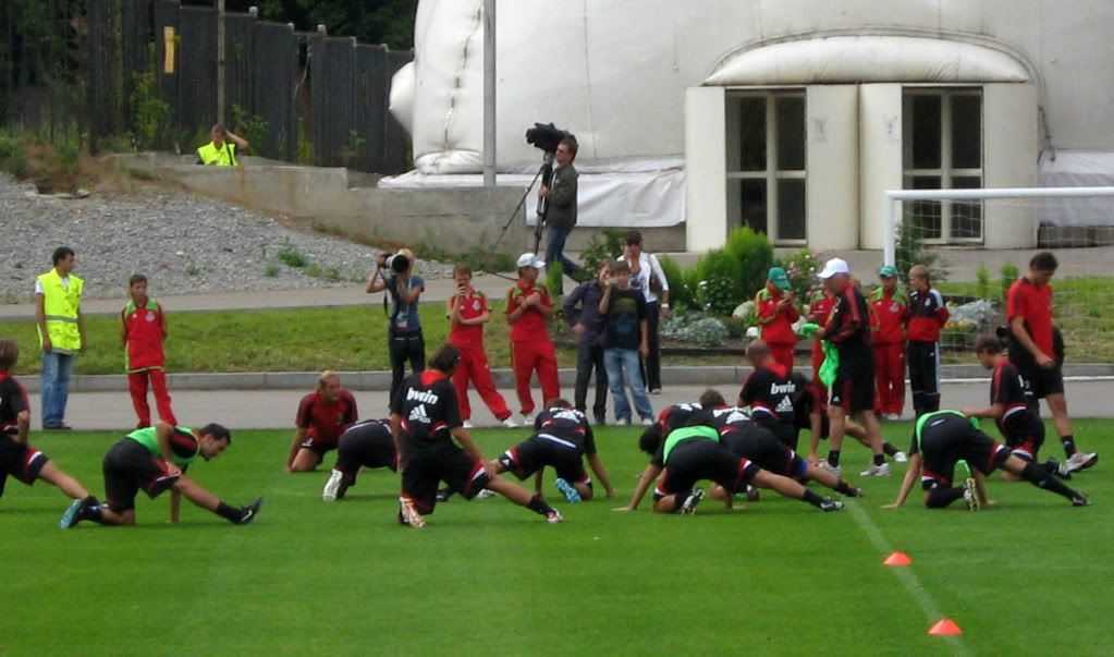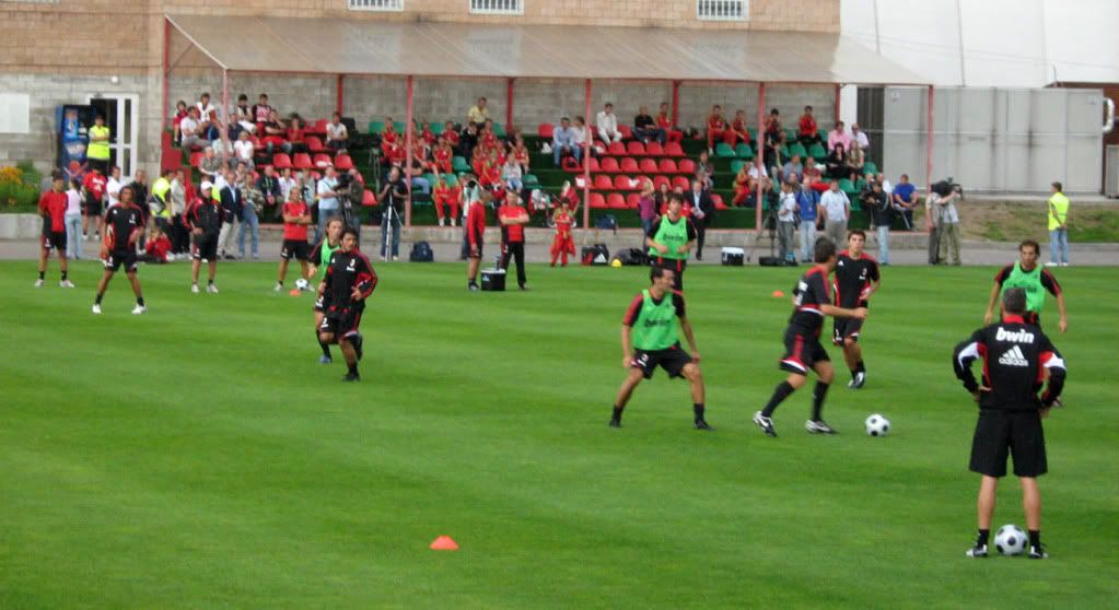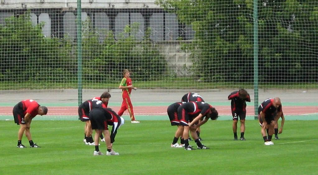 Тем временем миланцы вышли на поле, свеженькие, как огурчики. Мы просто поразились! В первых рядах бежал наш Капитан и улыбался. Все же он в потрясающей форме! По началу тренировка Милана выглядела весьма однообразно. Они бегали из одного угла поля в другой, периодически останавливаясь в этих самых углах и делая различные упражнения. Каха так усердствовал, что ему даже потребовалась помощь врача. К счастью, ничего серьезного.