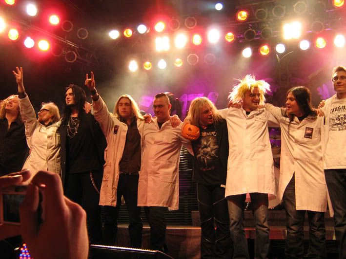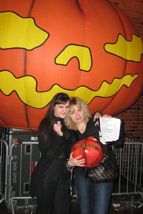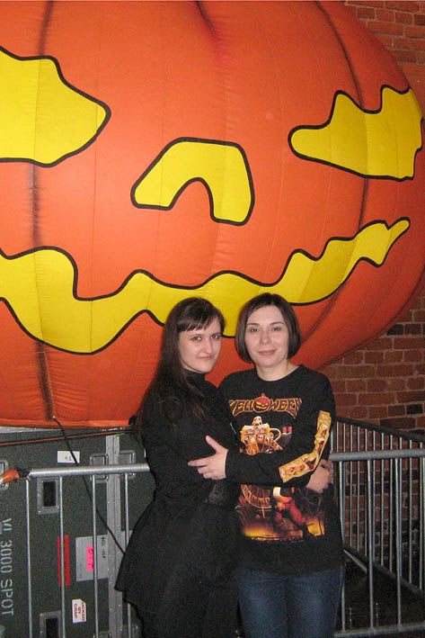 Ну и совсем уж на последок заиграли звуки "Dr. Stein", и на сцену были приглашены все, кто явился на концерт в белых халатах и в каком-нибудь безумнов виде. Я вот щас думаю, чего мы, балбесы, не вырядились в трех симпатичных медсестер? :)) Ну, в следующий раз. А пока, мальчик, который стоял прям перед Мэйкой, свалил на сцену, и Мэйки остаток концерта досматривали из первого ряда :) Что позволило им поймать обалденную резиновую Хэлловскую тыквочку! А ребята, тем временем, переобнимавшись с безумными "докторами", распрощались уже окончательно с залом. Покидали нам оставшиеся тыковки и сашкины медиаторы. Каким-то чудом три из них, один за другим оказались под моими ногами, чем я, естессно, не преминула воспользоваться :) А ребята ушли пьянствовать за кулисы! И тут снова подумалось, какое же счастье, что завтра это повториться ОПЯТЬ!