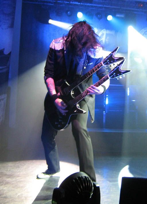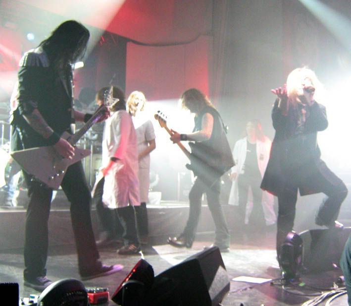 Ну вот, собственно и приехали:) 15-е декабря, Финляндия, Хельсинки, Дом Культуры, второй этаж, первый ряд, левая сторона, трое! Прям перед нами у самого края сцены был налеплен большой зеленый крест. И пока мы ждали выхода групп, все шутили, что это, чтобы ребята со сцены не попадали :) Но тут выскочили Аватарки, и мы поняли, что у крестика гораздо более серьезная и приятная миссия. А имнено, кто-нибудь из группы постоянно там "дежурил". Такаим образом виды у нас были просто потрясные! Аватарки так вообще, когда нас увидели, с этого крестика не вылазили :) Постоянно там торчал то Хенрик, то Йонас, то Симон. Йона тоже было вполне себе так видно, но особенно хорошо слышно. Не знаю уж, что послужило, может что мы сбоку стояли, но звук мог быть и получше. Вот в Тампере он реально был ИДЕАЛЬНЫМ! У всех трех групп. А тут Аватарок, конечно, хреново отстроили. Поскольку установка Йона стояла слева, нам вот ее больше всего и было слышно. Ну еще бас Хенрика, а вот Йоханеса, к сожалению, не очень. Но зато виды, ах, какие виды! ребята однозначно узнали обоих своих свежеиспеченных фанатов, и уделяли нам повышенное внимание, что приятно:) Мы постоянно с ними переглядывались, перемигивалсь, поднимали большой палец, показывали коз и так далее. И это было чертовски прияяятно:) Эх, классные ребятки эти Аватарки! Но правда, какие-то неправильные группы разогрева приглашают! Мозгопожирательные какие-то! :)