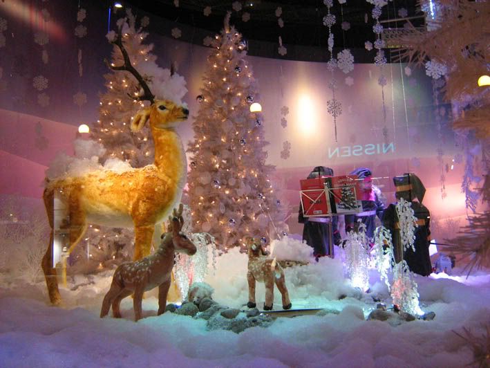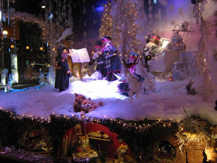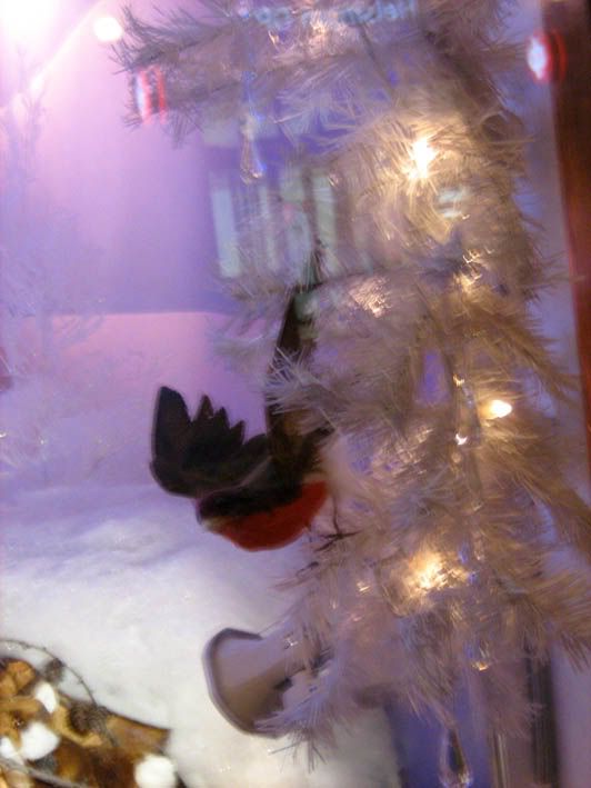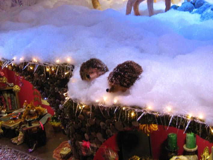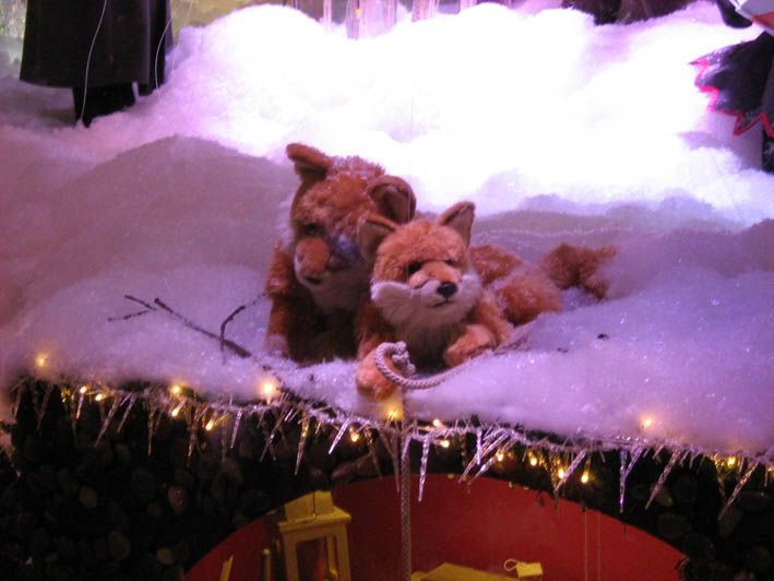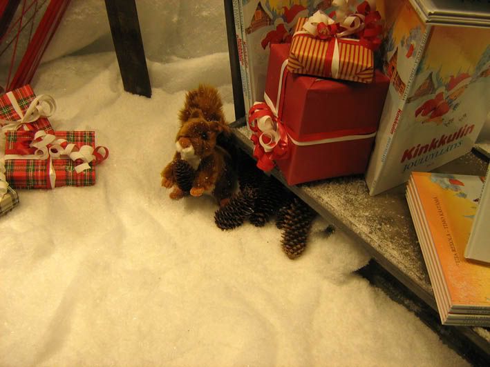 А потом я пошла погулять. Не успела выйти из отеля и дойти до перекрестка, как увидела Мэйку и Олю, заходящих в наш спорт-бар. Дело в том, что в этот день намечался матч Милан-Рома, и очень хотелось его позыркать. Но у финнов своя развлекаловка - хоккей! А в тот день как раз, видимо, был национальный чемпионат или еще что-то там. Короче, мы поняли, что мы тут со своими претензиями на Милан-Рому совершенно не в тему и ретировались :) Магазины на тот момент уже закрылись (да, вот такая я вредина:))), так что можно было спокойно погулять по предрождественским Хэллам, посмотреть на красоту и проникнуться атмосферой.  А посмотреть было на что! Одна только эта витрина вынесла нам мозг! Настоящая новогодняя сказка! И фигурки все движутся, и музыка приятная играет, и снежок медленно падает, и люди стоят и любуются, и на просветленных лицах улыбки! Каждая деталь витрины - это просто нечно! Такие вот йожики, птички, лисички, мышки, олененки, еще какие-то непонятные зверюшки, но выглядит все ей богу, как живое!