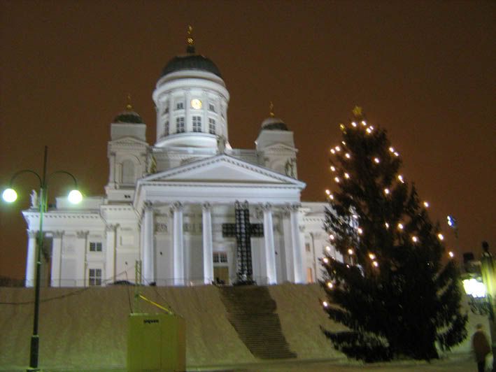 Ну и конечно же мы не могли не навестит нашего Алекса на кафедральной площади :) Перед собором, кстати, установили огромный черный крест. Но потом я видела на фото, что он, оказывается, светился. А вот главная йолка страны - это финский минимализм в чистом виде :))