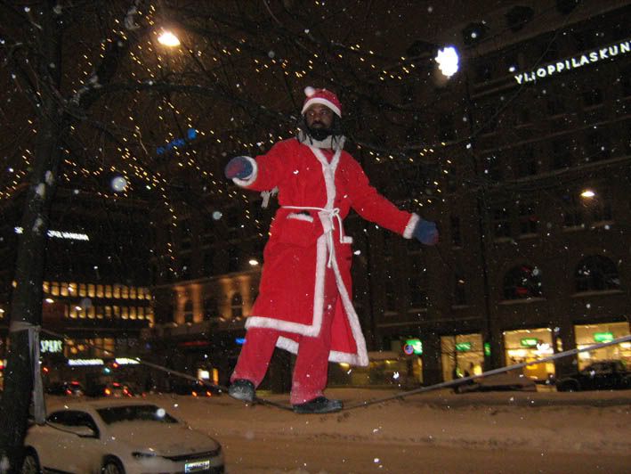 Конечно, чем дольше так сидишь, тем сложнее себя потом выдернуть из этой шикарной атмосферы и заставить тащиться на вокзал, тем более понимая, что опять черт знает на сколько покидаешь рай. Поэтому, чтоб хоть капельку скрасить тоску, мы с Мэйкой пошли в отдел спорт-товаров и с горя прикупили себе по паре найковский напульсников:)) В спорт зал что ли какой-нить записаться? :)) И тем не менее, пора... По пути к вокзалу нам попался вот такой необычный дед мороз, балансирующий на канате. И это, пожалуй, было последним впечатлением в этой поездке.