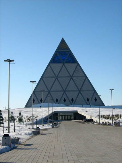 На этот раз решила съездить к Пирамиде – еще одной «достопримечательности» Астаны. Села опять на 21-й автобус, в надежде, что может быть он меня и туда отвезет. Не отвез. Сделал круг вокруг Байтерека (извините за тавтологию) и привез назад на вокзал. Решила зайти в справочное вокзала и там спросить, на чем же мне ехать к Пирамиде. И тут увидела, что здание вокзала оцеплено, перед ним толпа народу, всякие полицейские и пожарные машины. Офигев от такого зрелища, спросила у одного дяденьки из оцепления, что происходит. Он мне только и ответил, что вокзал закрыт (как будто я сама этого не вижу) и когда откроется неизвестно, что все поезда задержаны или отменены. Я в шоке! Во-первых, у меня там вещи в камере хранения. То есть, даже если была бы возможность уехать на автобусе, например, я бы не смогла. Во-вторых, в Астане у меня из знакомых только Президент страны, но, к сожалению, он об этом не знает. В-третьих, перспектива остаться ночью на улице в тридцатиградусный мороз меня отнюдь не прельщала. Торчать перед вокзалом, в ожидании известий, тоже. Поэтому я все же поехала к Пирамиде. Совершено без туристического настроения, а просто потому, что в автобусе хотя бы тепло.