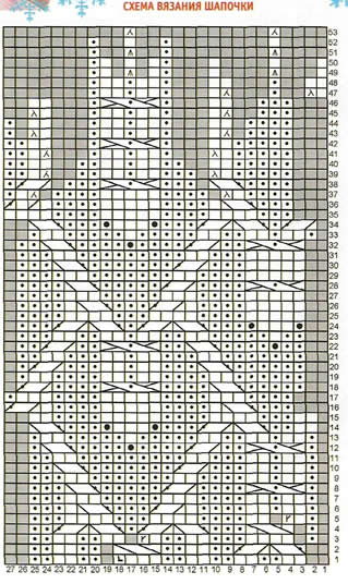 В следующем ряду перейти к вязанию узора по схеме, повторяя раппорт 6 раз (при этом распределить узор таким образом, чтобы «коса» с шишечками расположилась посередине передней части шапочки), при этом равномерно сократить 8 петель. Вязать по схеме, на которой приведены все круговые ряды. По завершению вязания стянуть оставшиеся петли, завязать «хвостик». Шапочку обвязать крючком следующим образом: 1 ряд столбиков без накида по 2 столбика между каждыми двумя парными петлями резинки; обвязать все «рачьим шагом».