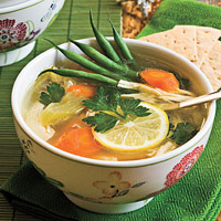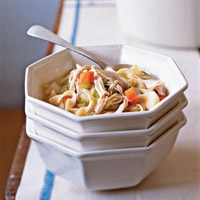 4. Отварить яичную лапшу согласно инструкции на упаковке, не добавляя соль или масло. Равномерно разделить лапшу по 8 порционным тарелкам, залить 1 1/2 половника куриного супа с сельдереем.