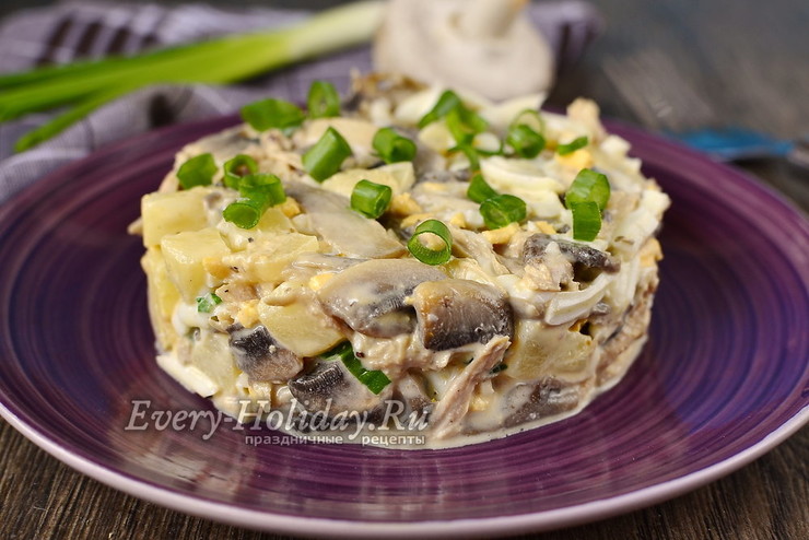 Такой салат с курицей, грибами и ананасом настолько оригинальное и потрясающе вкусное блюдо, что его обязательно нужно приготовить для праздничного застолья в честь Нового года.