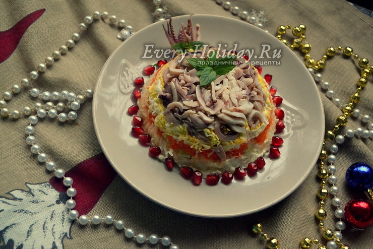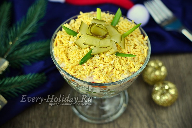 Этот салат заслуживает того, чтобы быть в самом центре новогоднего стола. Рецепт приготовления этого салата очень простой. Дело в том, что он имеет настолько потрясающий вкус, что сметается со стола в первую очередь.
