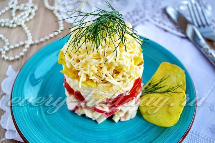 Приготовьте к праздничному столу слоеный салат. Такое довольно нестандартное сочетание ингредиентов дает в результате вкусный, яркий и сочный салат