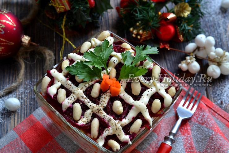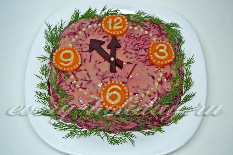 Мы решили предложить вам вариант оформления салата Шуба в виде новогодних часиков. Кроме того шубка для этого салата приготовлена из запеченных в духовке овощей и приправлено блюдо домашним лимонным майонезом.