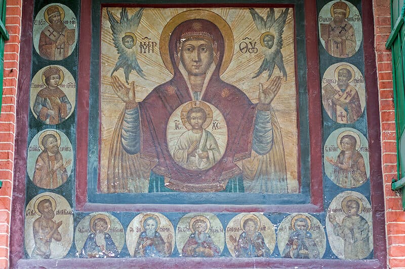 Самая старинная из них — фреска «под кирпич», которой украсили фасадные и внутренние стены храма ещё в период строительства. В то время кирпич был новым и очень дорогим материалом. Чтобы его сохранить, стены покрывали штукатуркой, а чтобы подчеркнуть богатство храма, сверху наносили роспись с изображением кладки. Сейчас такие фрески можно увидеть в центральном храме и в церкви Александра Свирского.