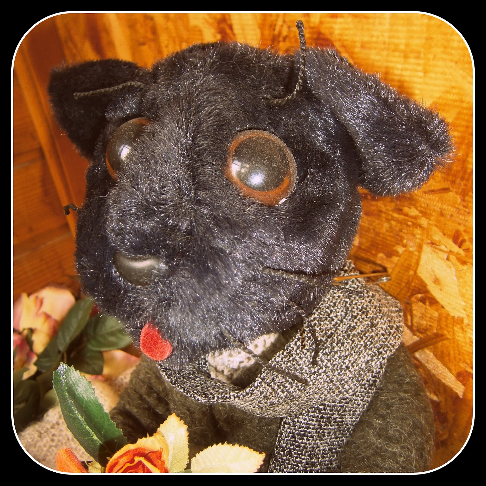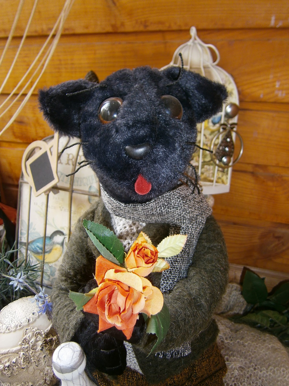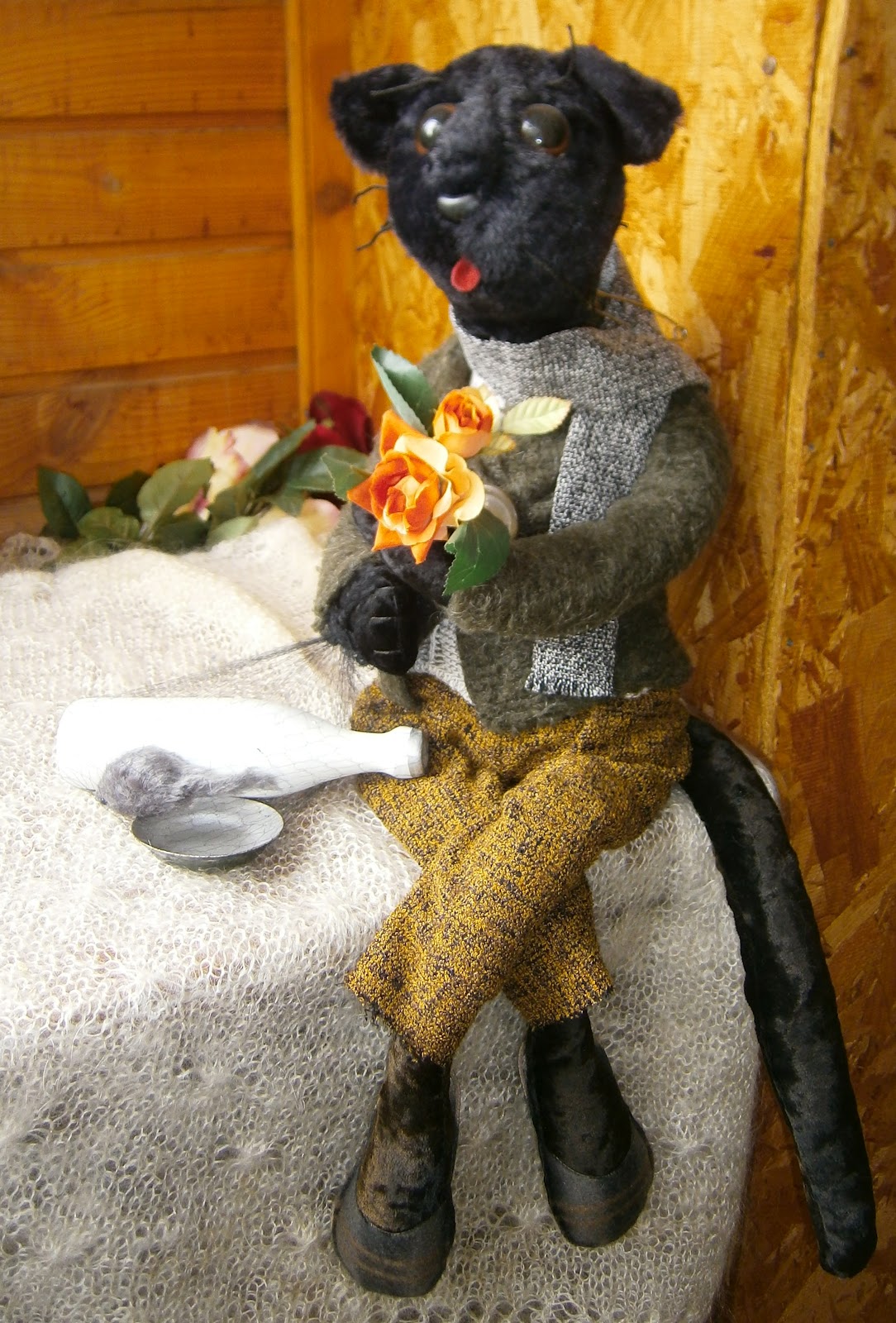 Явно собрался на свидание, в руках букет цветов, в авоське (это кто помнит - сумка такая, вся из дырочек сделанная) бутылочка молока, мисочка и мышка на закуску. Авоська сделана из сеточки для волос, к сожалению очень старенькая и местами продранная. Если найду такую где-нибудь - заменю.