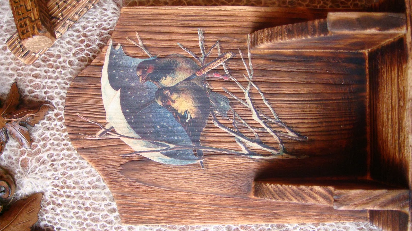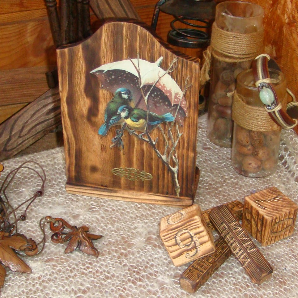 Как только их увидела, влюбилась всерьез и надолго )). Сосновая заготовочка с чудной структурой. Естественно без обжига и брашировки не обошлось )). Думала зверей сюда, либо диких, либо лошадей в честь наступающего года, но пока перебирала свои запасы карт, наткнулась на вот этих птичек под зонтиками. И не смогла уже от них отказаться, так они к этой структуре древесной подошли, как буд-то тут и были задуманы. Приклеила, положила чуть теней и они стали совсем живыми ))), объемными. Буквы и цифры жидкой поталью и темная тень, чтобы было лучше видно. Лак выбрала бархатный, теперь календари теплые и бархатистые на ощупь, только на месяцах и числах блеск старинного золота. Филигранный маленький элементик сзади и, вуаля, вечный календарь готов.
