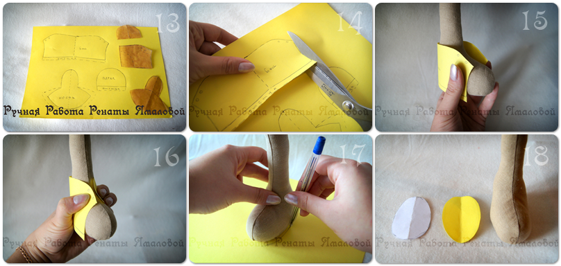 Для таких ботинок нужна нога на плоской подошве (как на первом фото), о том как сделать такую для игрушки тильда подробно написано у Нади Панкив. Не плотно оборачиваем ногу, как-будто на ней ботинок, обычной хлопковой тканюшкей, обязательно чтобы она не растягивалась. Ткань накладывается по косой относительно поперечного шва. Закрепляем булавками, стык ткани делаем сзади (фото №4) Обрезаем лишнюю ткань, чтобы не мешала. Делаем разрез посередине, чтобы ткань не тянуло (фото №5). Хвостики плотно натягиваем на подошву, нужно постараться, чтобы складок было как можно меньше.