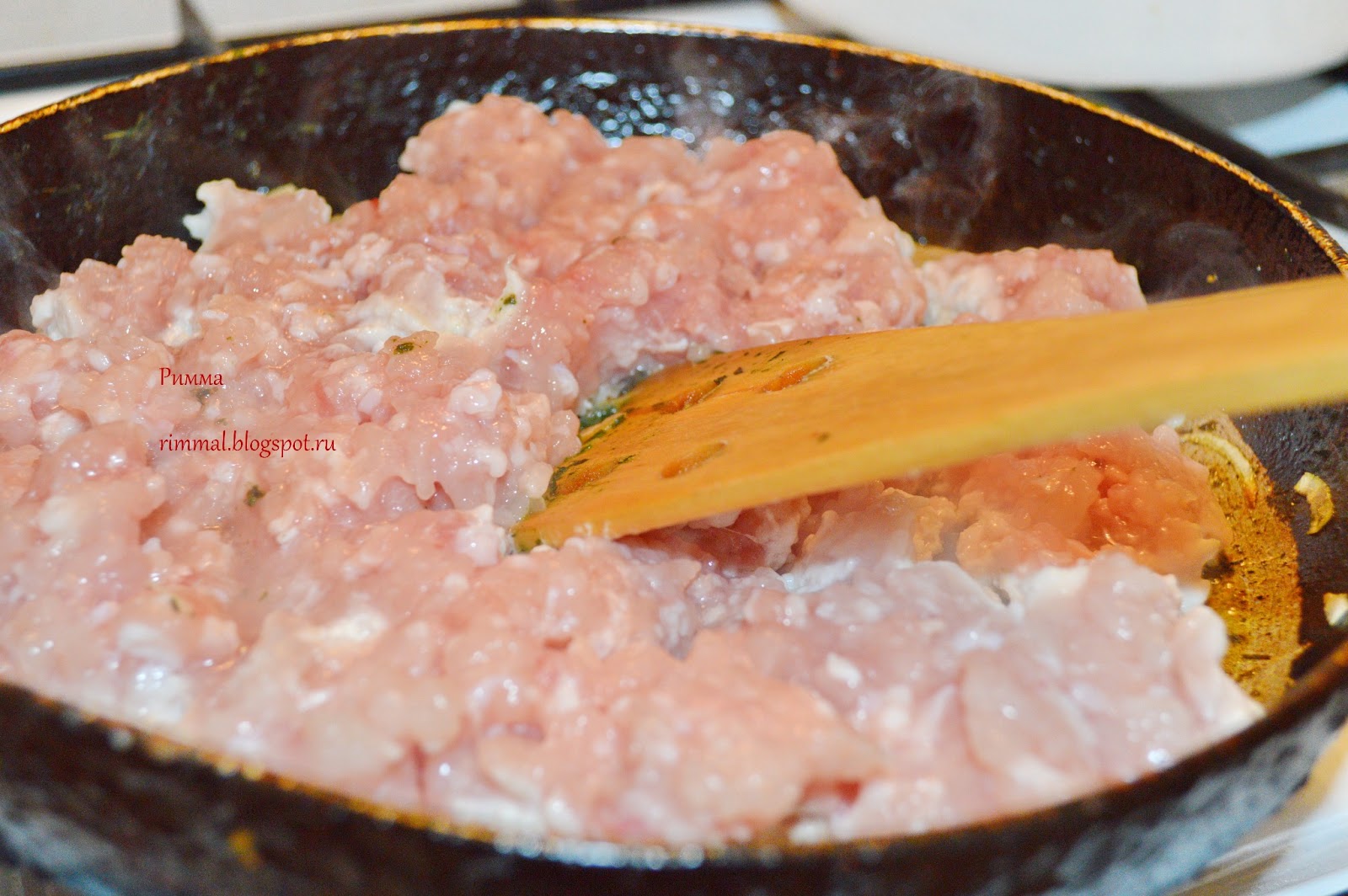 Положите к нему фарш и тушите до готовности.
