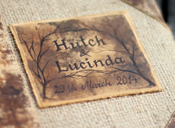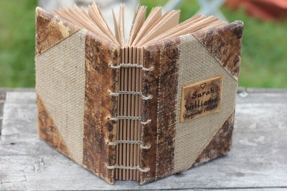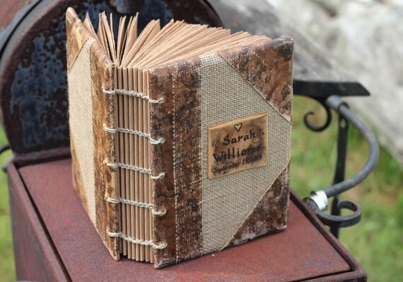 Rustic wedding guest book leather and burlap 7 1/4 x 5 1/2 with names and date
