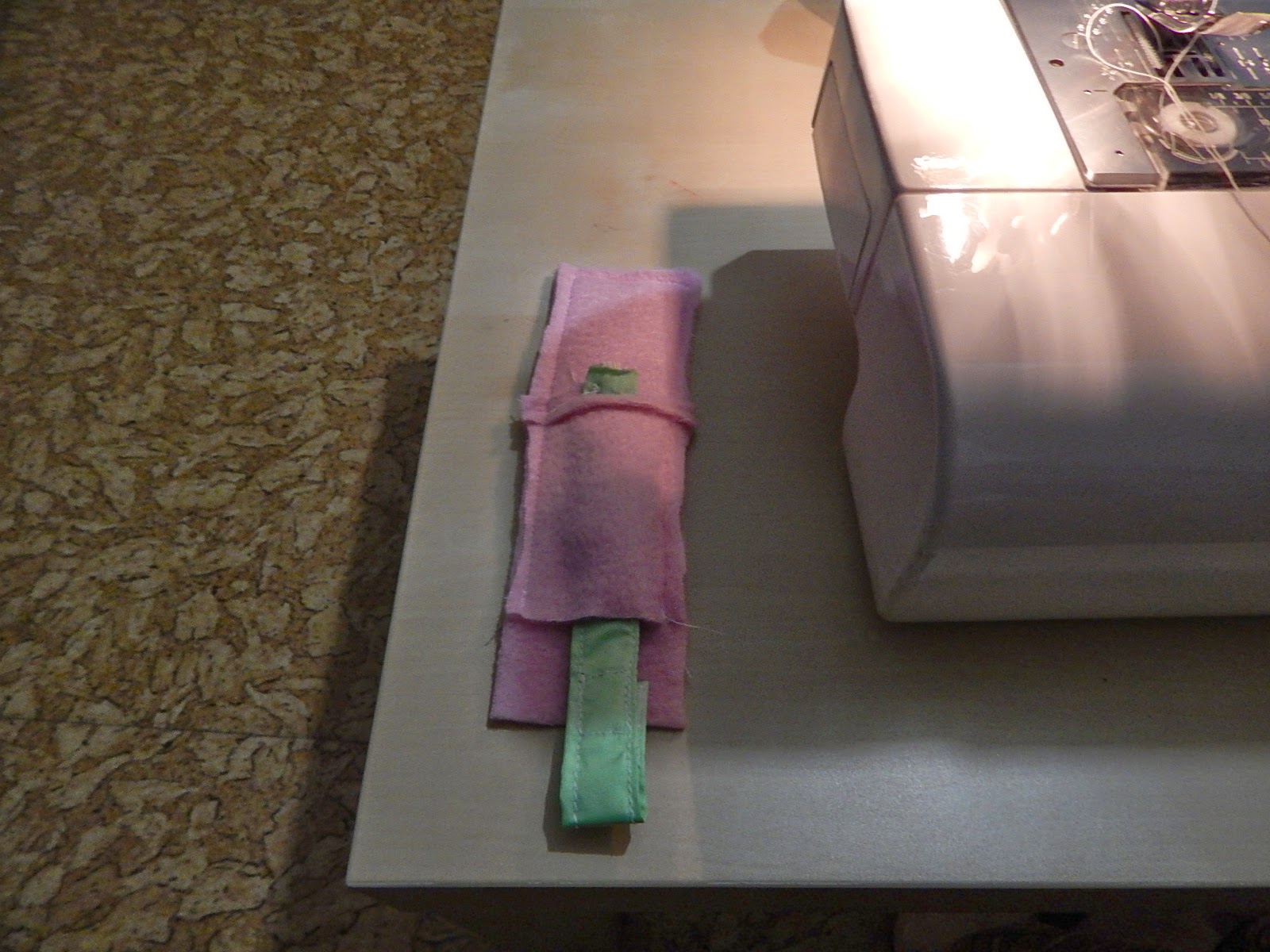 Теперь берем другую ткань, потоньше (у меня это плащевка), отрезаем 22 на 5 см. Складываем пополам вдоль, вставляем резинку, загибаем внутрь припуски и прошиваем на машинке так, чтобы зафиксировать начало и не задеть иглой резинку по длине детали. Дошили до конца, натягиваем резинку, пришиваем липучки для крепления игрушек.