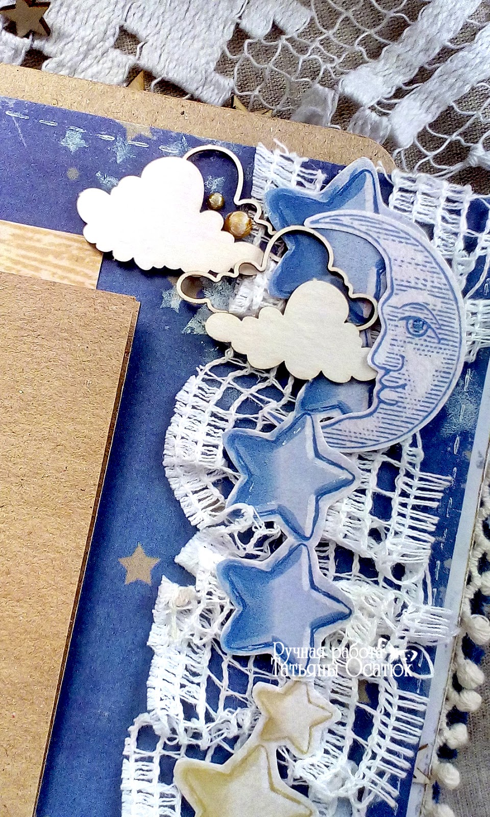 Пара слов о материалах, если кому интересно. Бумага, как уже писала, от Караликов, авторства Вики Клабуковой, вырезалки типа звезд, лун и мишки тоже оттуда, один листик правда затесался от Полькидот), винтажная хлопковая тюлька, вязаные салфеточки моего исполнения, шебби-ленточки, тесьма с помпошками, обалденные деревянные спильчики, подаренные мне
