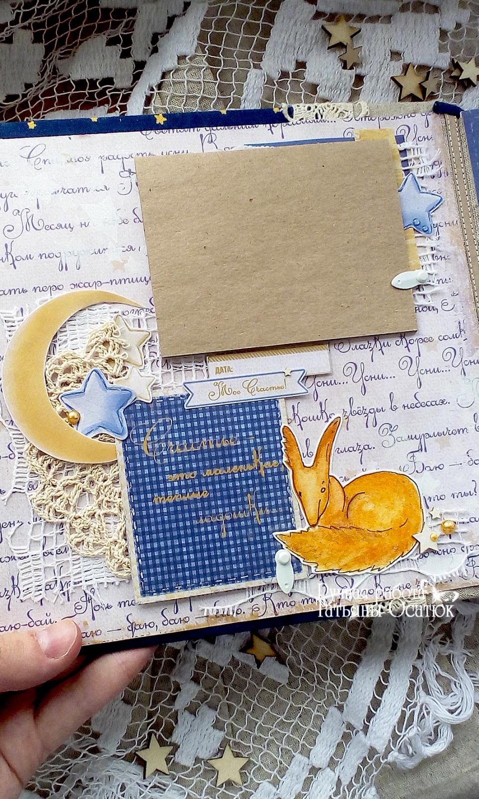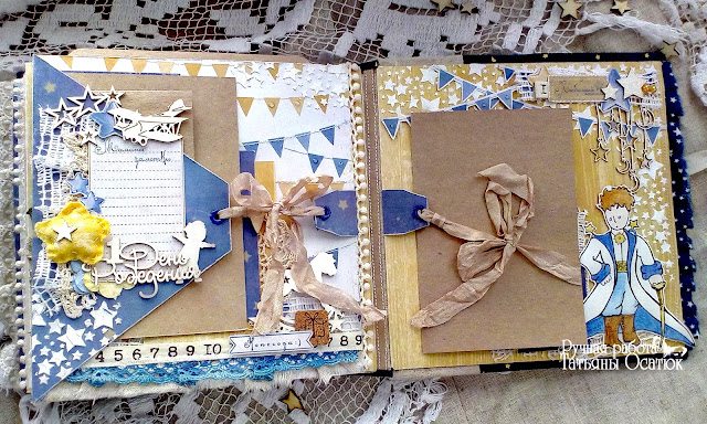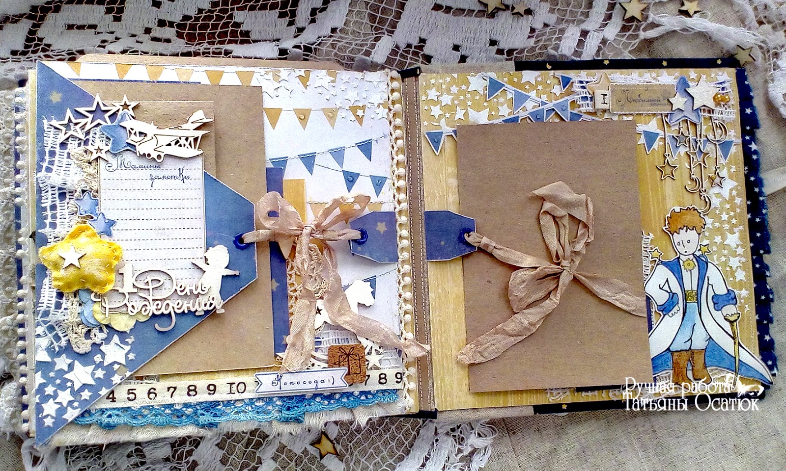 Я, между прочим, не с пустыми руками. Буду показывать альбом, сделанный на заказ для моей любимой заказчицы, вернее для ее годовалого сыночка. Альбомчик в переплете, размером 20х20, на 5 разворотов из совершенно моей-моей бумаги от Караликов "Маленькйи звездочет". Я таааак ждала эту бумагу в России и к прибытию заветных листиков у меня уже была заготовлена тканька на обложку и общая концепция альбома по мотивам многими любимого "Маленького Принца" Экзюпери. Впрочем, вы сами сейчас все увидите.