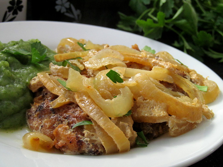 Обжаренную печень выложить слоями в горшочки для запекания, прослаивая нарезанным луком. Каждый слой немного посолить и поперчить.