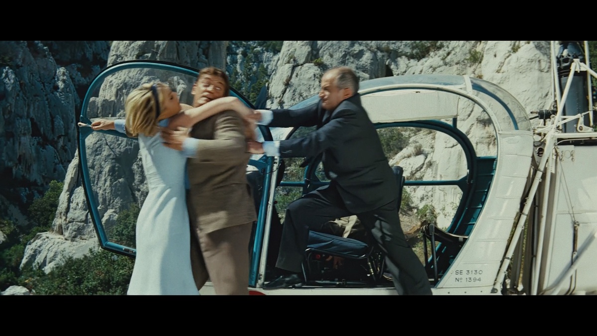 Луи в огне образа был неудержим в эпизоде на пляже у вертолета он так рьяно разъединял возлюбленных и оттолкнул Демонжо так, что актриса упала и ушибла колено. А еще вцепившись в Маре в одном из дублей он порвал ему пиджак, да хватка у комиссара будь здоров.