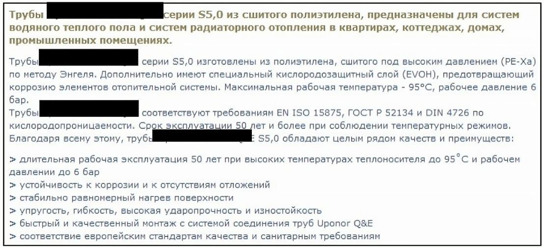 Указывается максимальная рабочая температура 95 ºС и срок эксплуатации 50 лет, но умалчивается, что на трубу данная температура может действовать максимум 1 год из этих 50 лет.