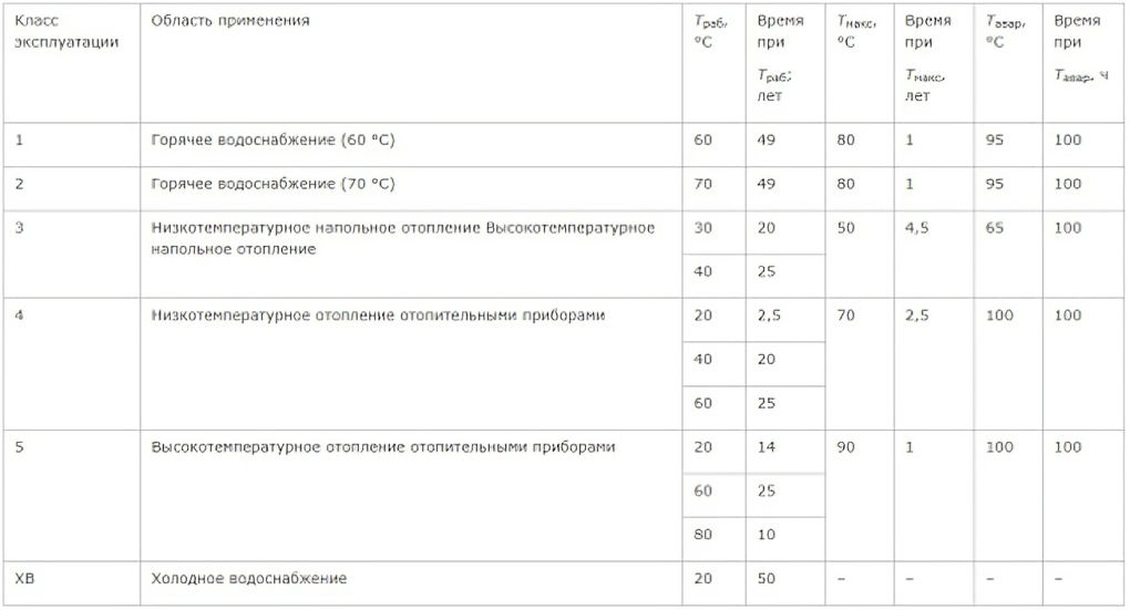 Условия применимости пластиковых и металлопластиковых трубопроводов на территории Российской Федерации регламентируются ГОСТ 52134-2003. Так как на прочность пластиковых трубопроводов довольно ощутимо влияет время воздействия на них теплоносителя с определённой температурой, то для них установлены классы эксплуатации (табл. 1), которые отражают характер воздействия определённых температур на трубу в течение всего срока эксплуатации.