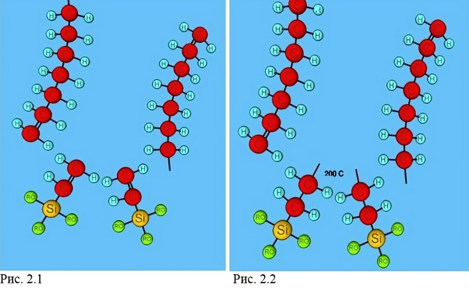 В настоящее время для производства PEX-труб по методу «b» в основном используется винилтриметаксилоксан (H2C=CH)Si(OR)3 (рис. 2.1). При нагревании связи винильной группы разрушаются, превращая его молекулы в активные радикалы (рис. 2.2).